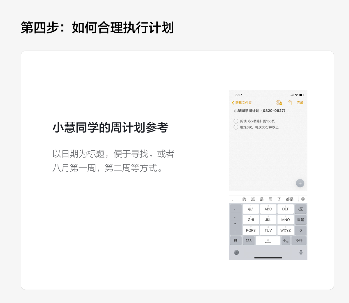 备忘录里,可以先以周为单位,列举出你月计划中,每周要完成的任务。拿小慧举例子,第一周要阅读一本新书的四分之一,另外还要锻炼3次,每次不低于30分钟。如图。