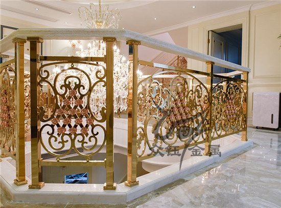众钰金色铝雕玫瑰金镶花铝艺楼梯栏杆:色泽新颖,造型新颖、花样新颖、风格新颖,可按照您的要求来定制。