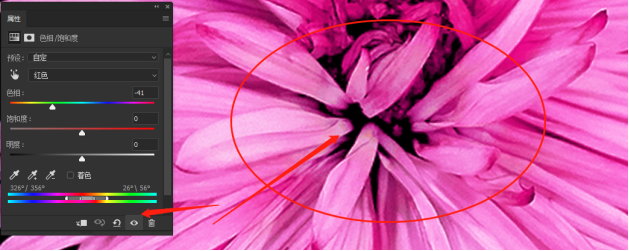 8、使用色相饱和度将画面中花瓣的颜色统一,如下图所示。