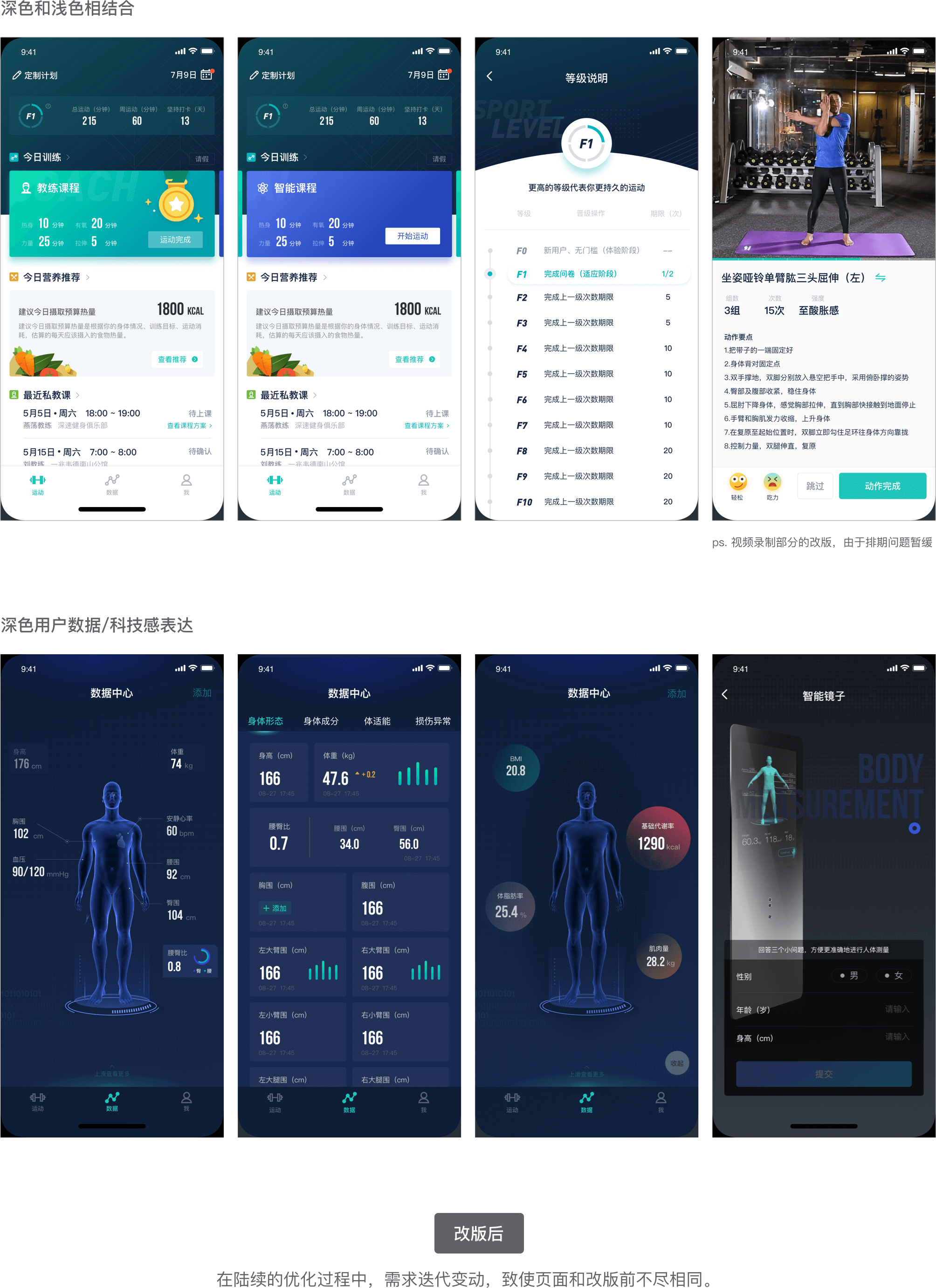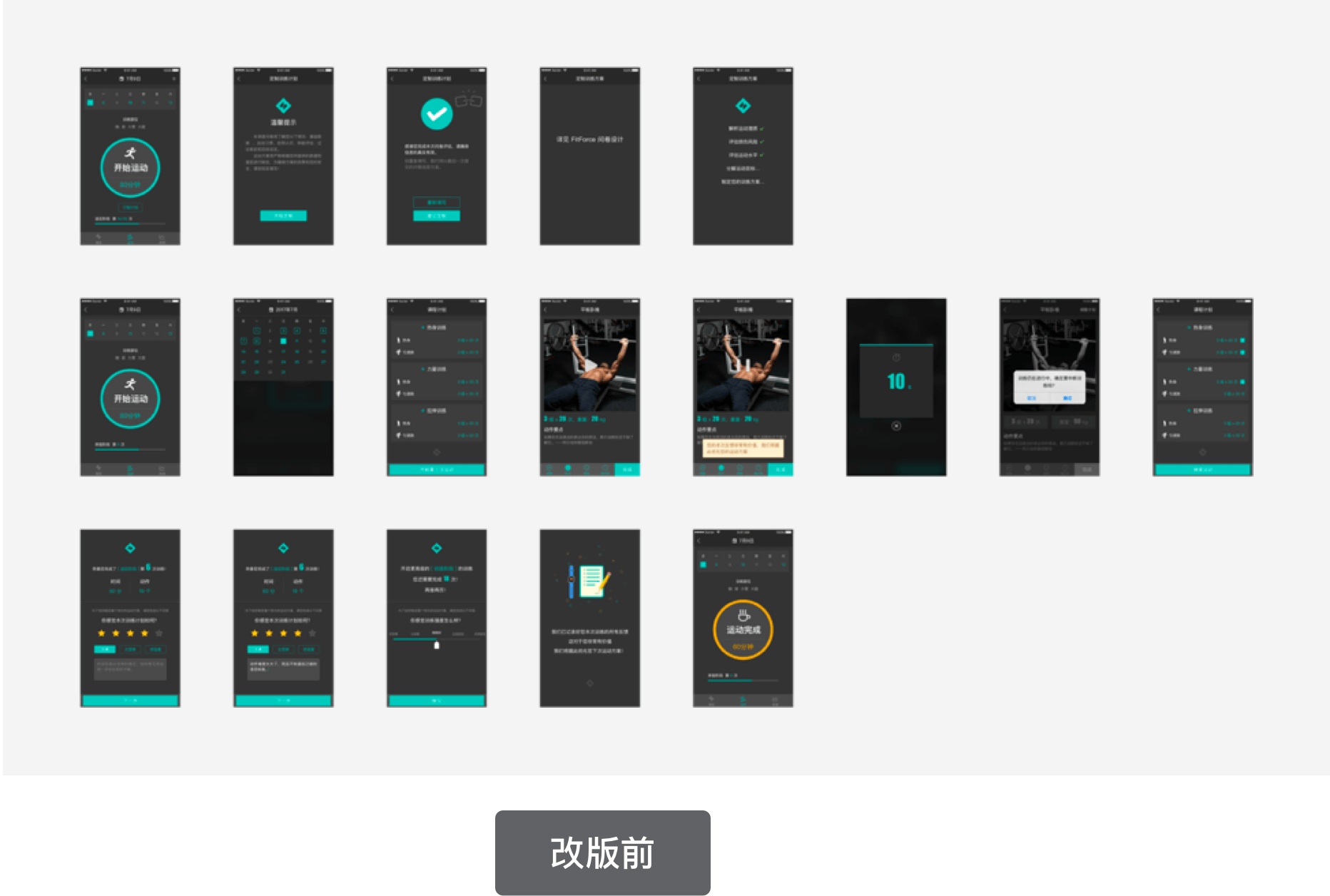 由于去年接手《FitForce》项目时:APP全一系深色调背景。在开始设计迭代之初,我以一个真实的用户姿态来体验APP整个流程,看整体页面,在体验的过程中开始质疑一些点以及有了想要动手优化的冲动。
