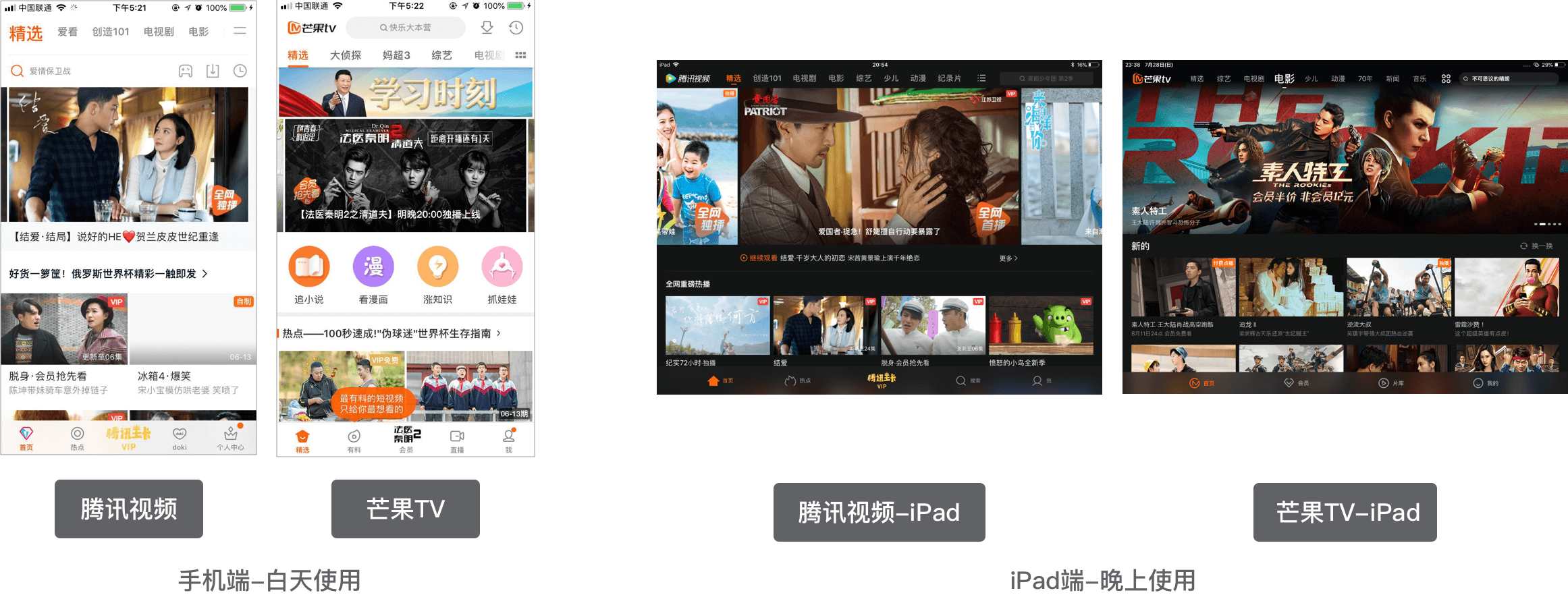 如:视频类软件,使用场景的不同,背景颜色会有所变化。白天在外的人们看视频一般都会用手机,在白天强光下和频受打扰的环境中,白底黑字更清晰更易阅读。晚上回到家,人们则更愿意拿起iPad享受大屏观影体验,在不易受打扰的环境,深色背景和夜晚更契合,让人更沉浸。