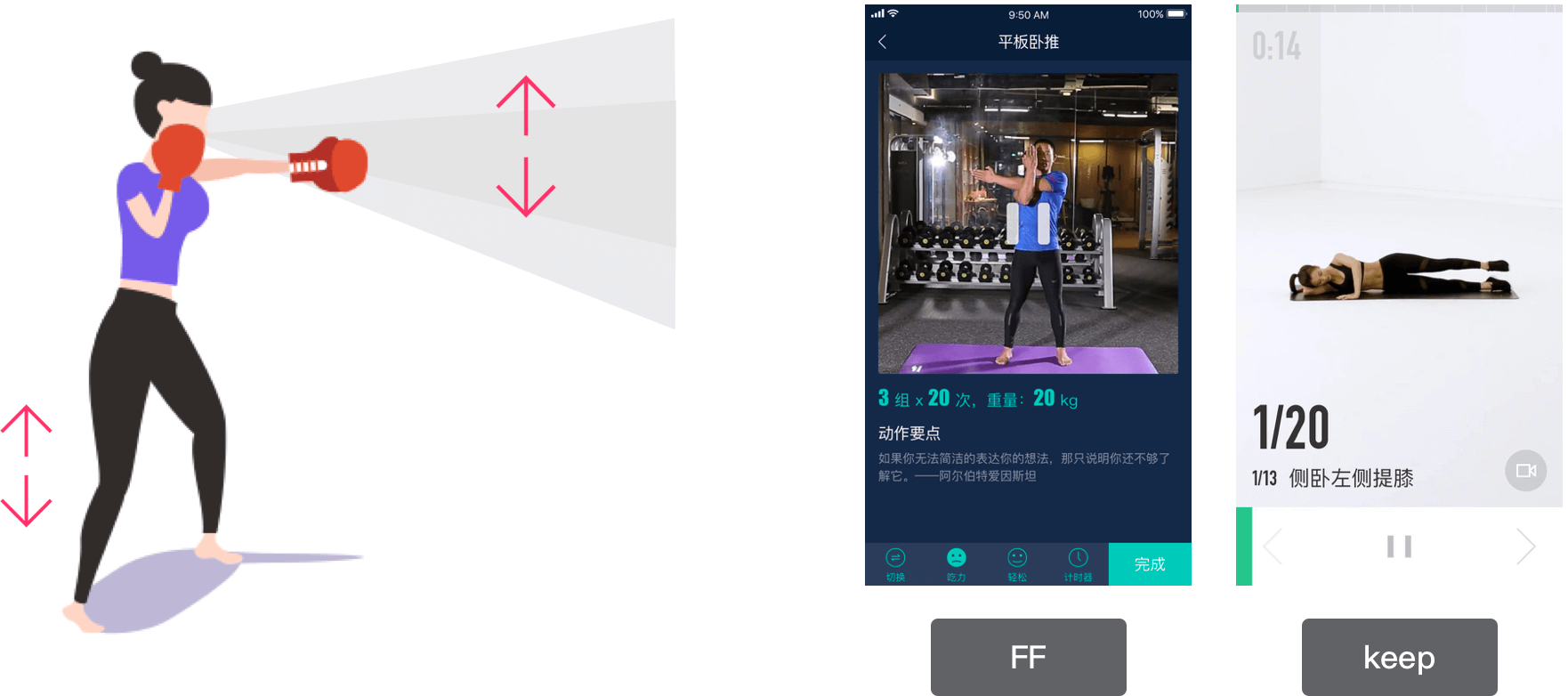 情景:拿着手机看教程 + 互动:跟着教程完成运动。在这样的情景中,以产品的“同理心”换位体验,跟着手机教程一起运动,应考虑到用户在使用的过程中(如:拳击;开合跳等幅度较大的动作)视线波动导致的视觉模糊的情况。