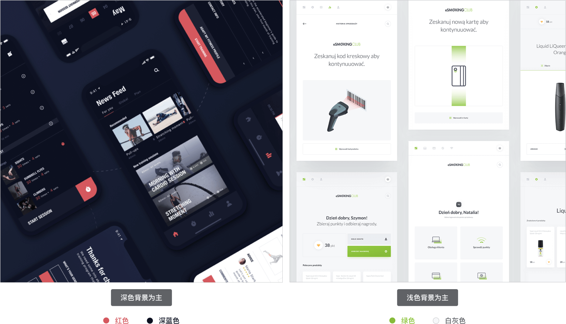 市面上APP形色各异,缤纷多彩。除了品牌主色调外,大面积背景色的使用,会给用户不同的视觉感受和情绪传达。如下图,左侧:红色为品牌色;深蓝色为背景色。右侧:绿色为品牌色,;白色/浅灰色为背景色。