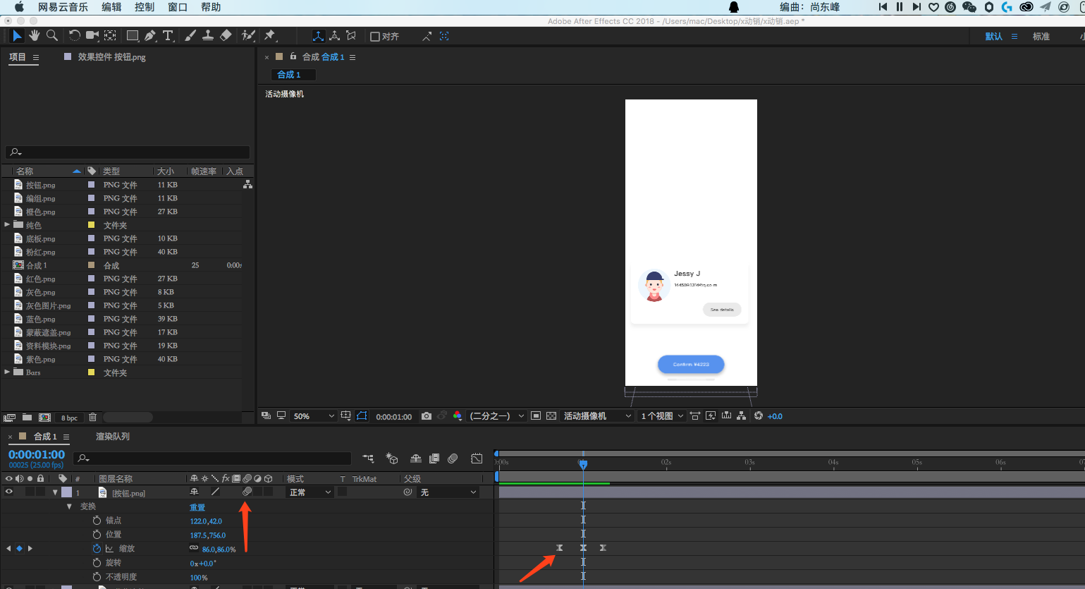 给苹果x 视频图层添加父子关系,给样机图层添加位置属性关键帧(缓动和运动模糊一定要在动销最后添加).