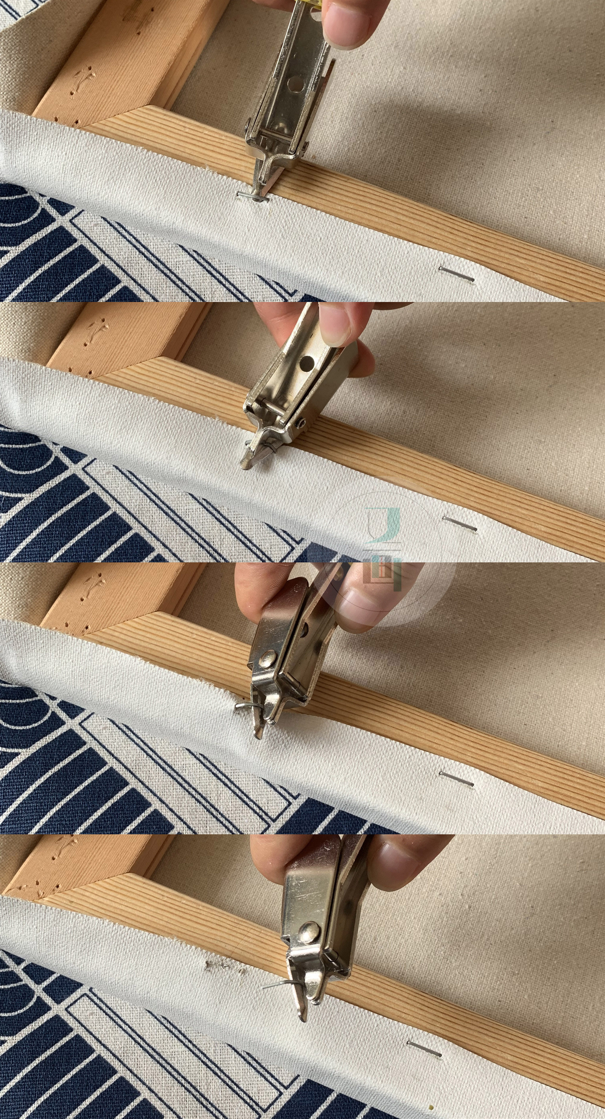 用同样的方法,将画布固定在内框的四个中点上。这时候要求画布受力均匀,如果出现歪歪扭扭的效果,就需要用起钉器拆掉,重新绷框。