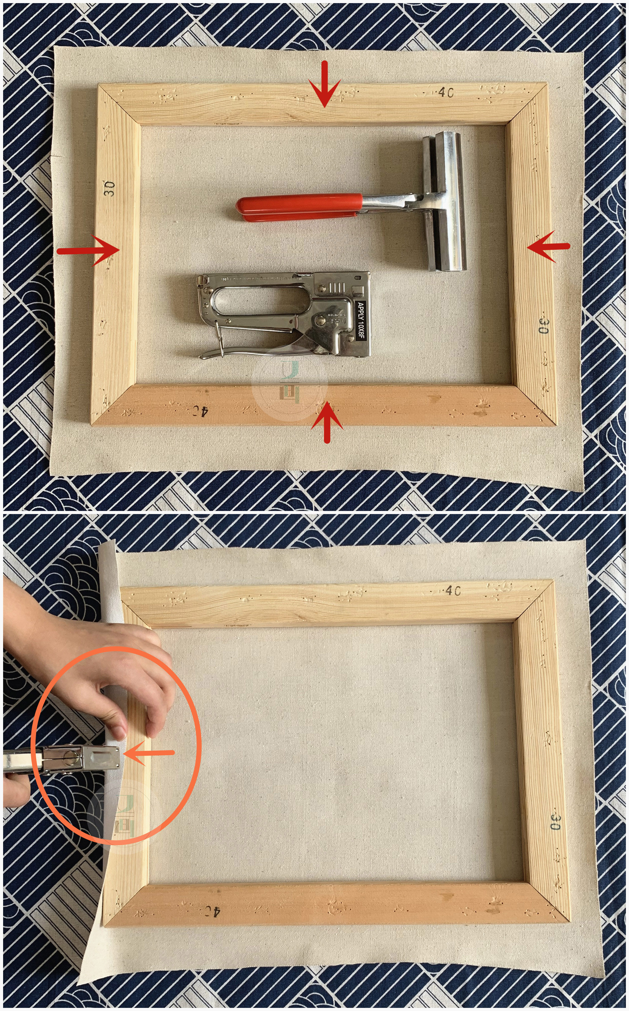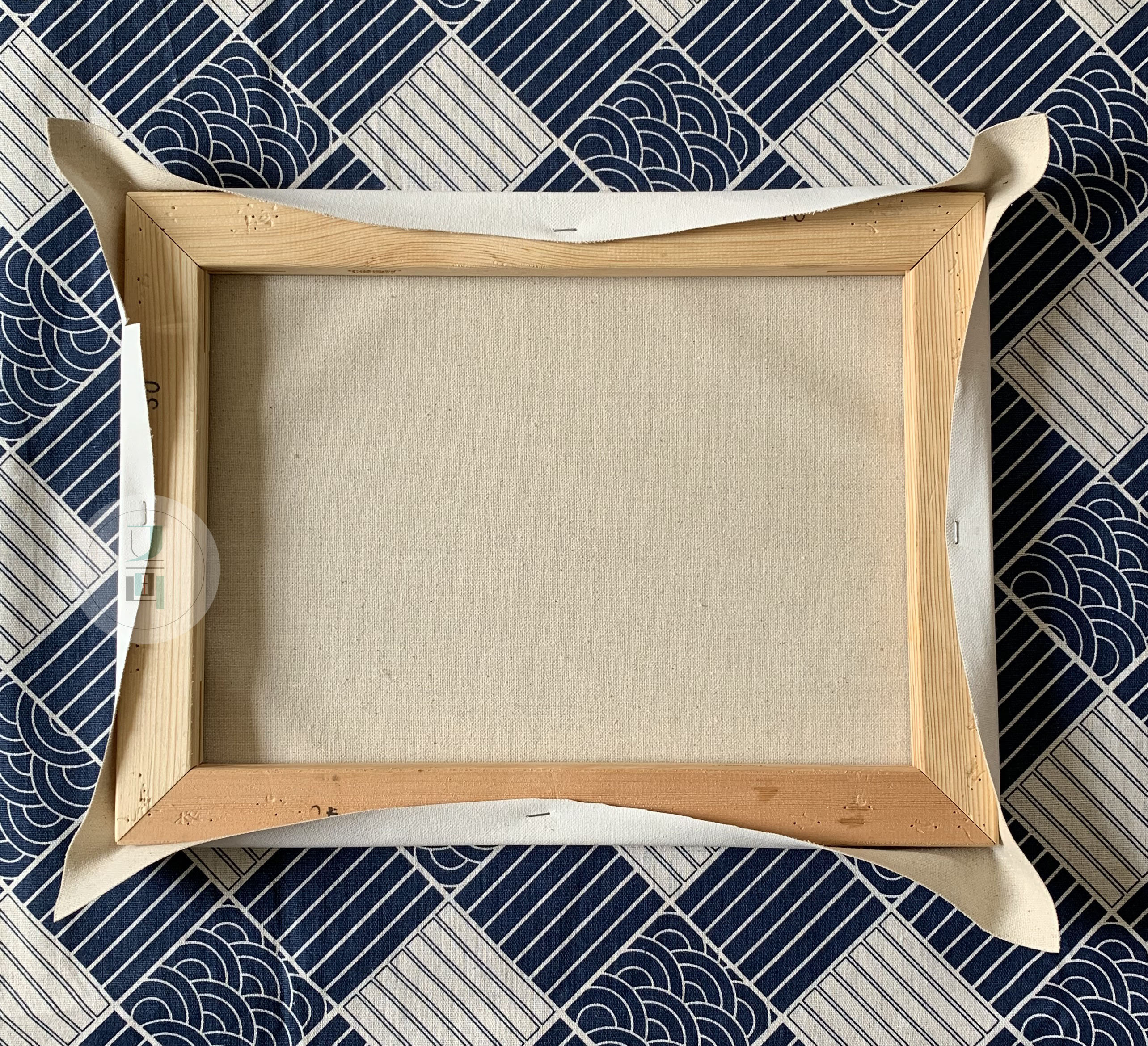 重复用绷画钳拉直绷紧画布和用钉枪固定画布的步骤,将画布固定在内框的四个边框上。