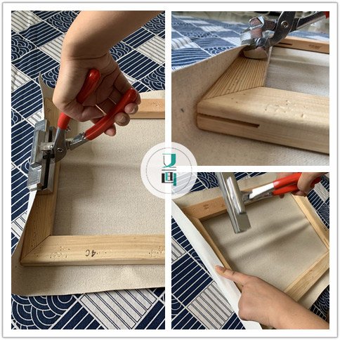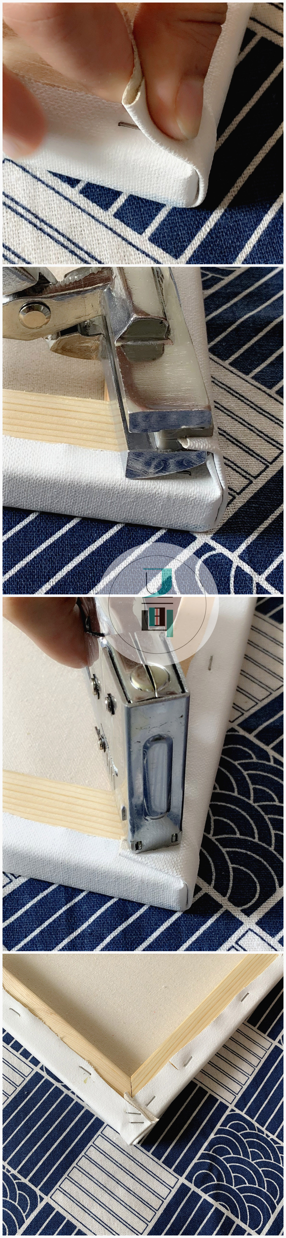 包角的时候先将角折好,最后用绷画钳拉紧、钉枪固定。因为包角时画布重叠在一起,建议用钉枪钉两次最为稳固。