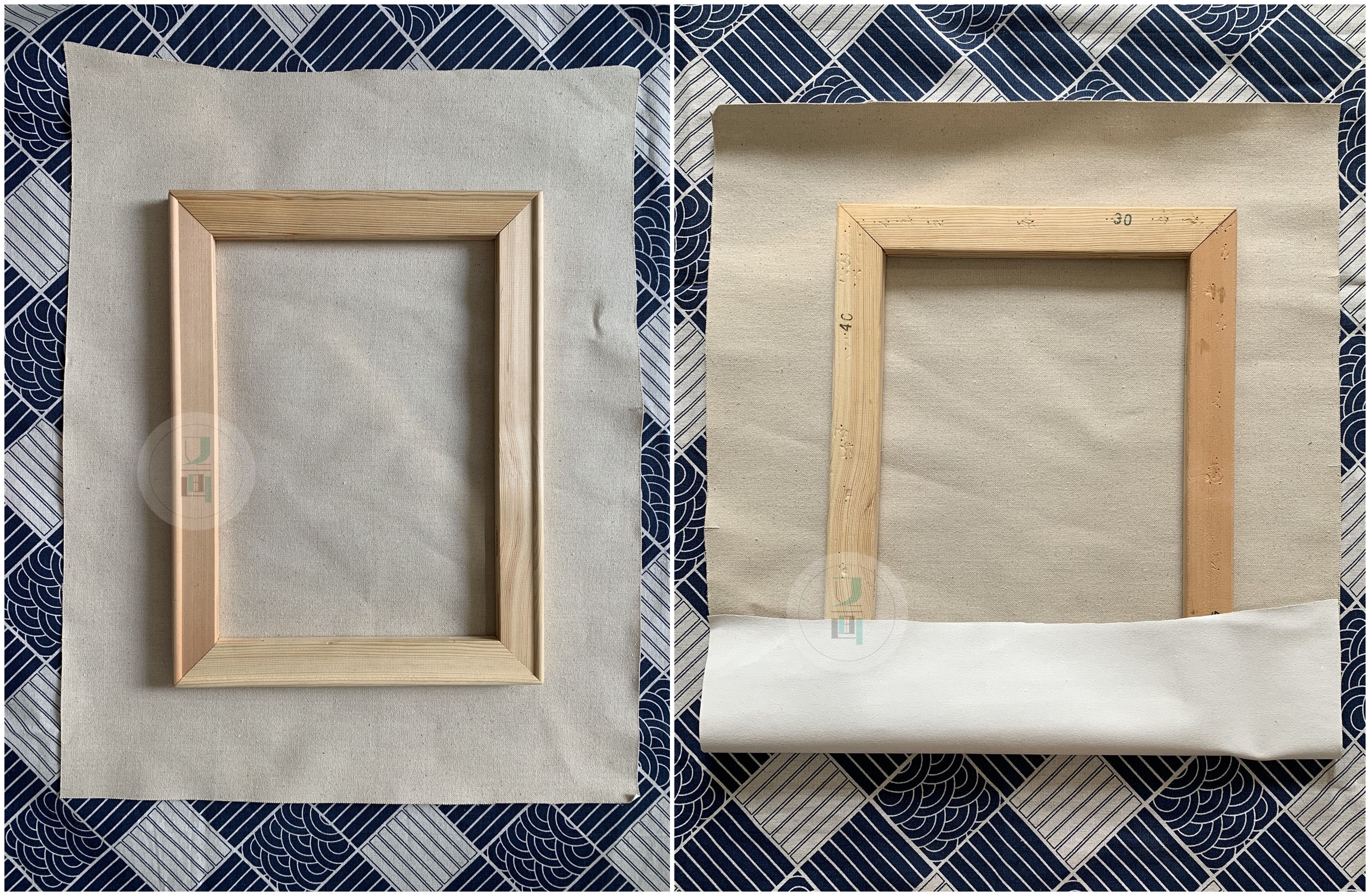 将画布平铺,内框放在画布上。我们会发现,画布偏大。预测一下画框的大小,如果不进行裁剪,那么绷框后会有多余的布料,会显得画框很笨重,没有任何的美观效果。