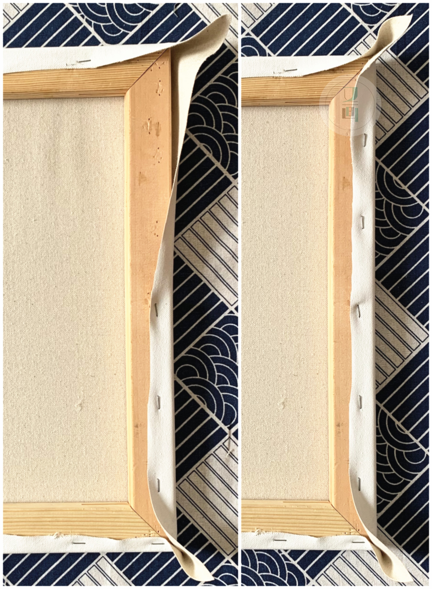 我们可以预留画布的宽度,一般将画布折上来,宽度为内框边宽的一半为宜。