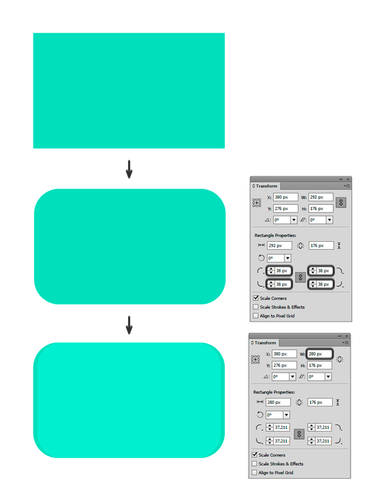 先使用矩形工具(M)绘制一个292×176 px的矩形,颜色填充为#64DDBB。在“变换”面板中将拐角半径设置为38 px。