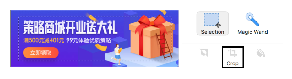 双击图片后会进入图片编辑模式后,直接框选后点Crop(裁切),选区外的区域即被裁掉 (跟PS里一样: 按住shift框选是增加选区,按住Alt框选是减小选区;拖动选区内部可以移动选区位置)