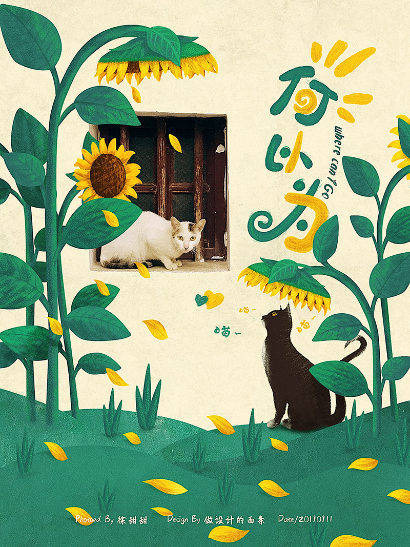 刚好向日葵是一种带给人温暖阳光的花,然后,在一个花瓣纷飞的午后,一只猫咪蹲在向日葵下面看着另一只喵咪,它也想有个家,故事就这么开始了。