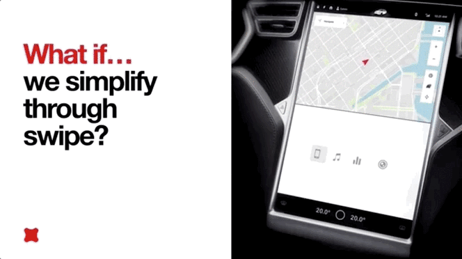 在特斯拉的驾驶位和副驾驶位中间有一块17英寸的触摸屏,整合了导航地图、HVAC(恒温系统)、影音播放等许多功能。如今触摸屏已成为各大车辆设计的标配,大家也对其设计的原则有所共识:触摸屏的操作必须方便,且不可以使驾驶员过度分心。为确保驾驶员开车时对路况的专注力,应多使用手势交互形式,以取代传统的“点选”交互形式。在“点选”实际操作中,其实包含了多个复杂动作:首先,视线从挡风玻璃移开,瞄准屏幕中所需选择的功能区域。然后,右手手指离开方向盘,在空中移动到该区域附近。最后,用手指精准触碰该区域的屏幕。由此我们不难发现手势交互的优势: