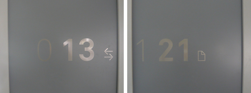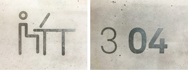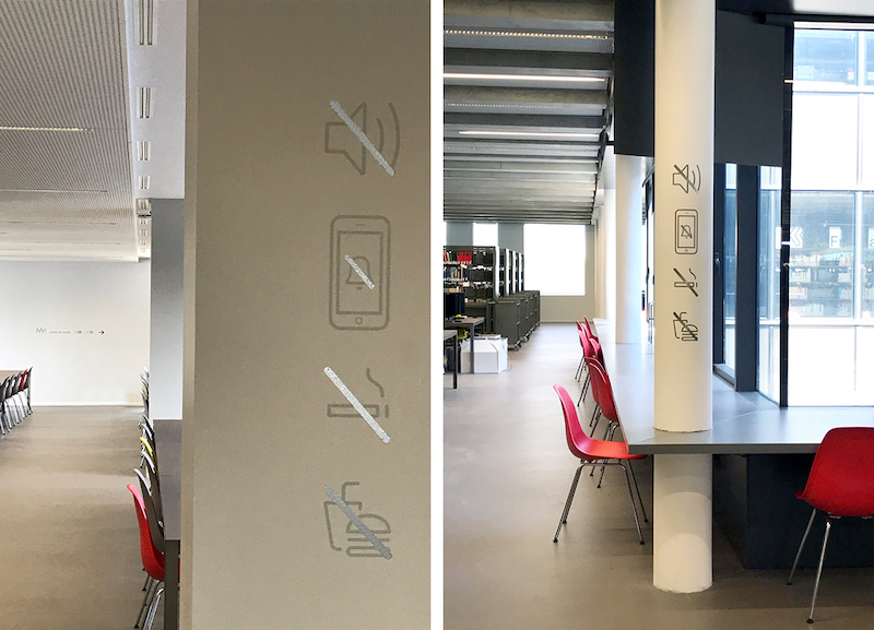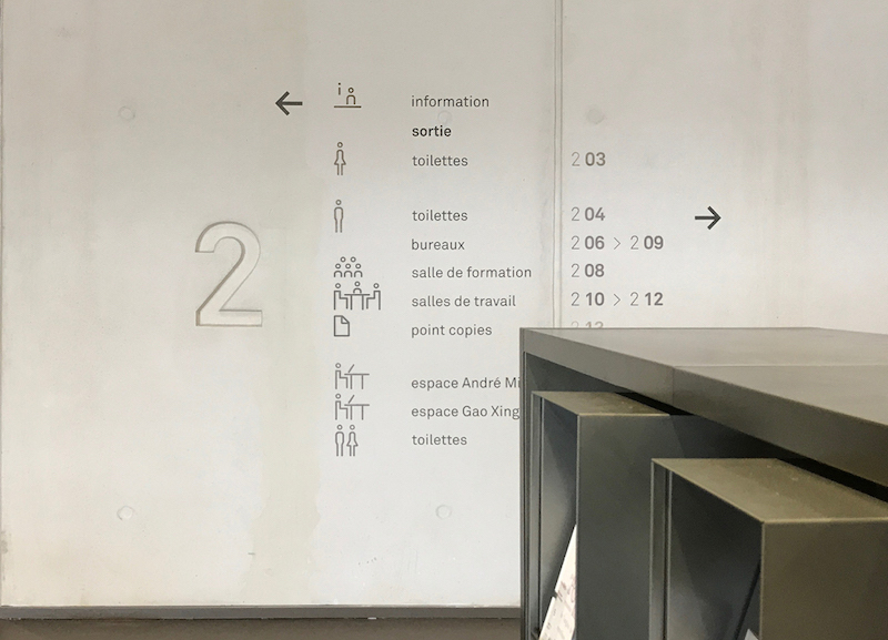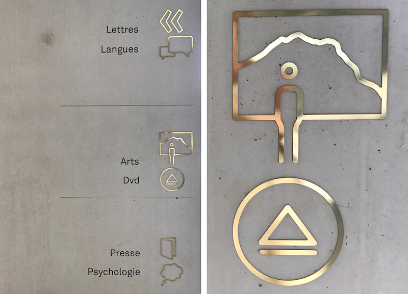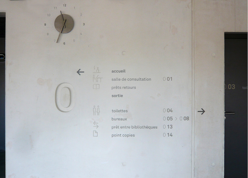 户外精神堡垒置于图书馆门前的梯式种植区域,与环境相融合。基于图书馆内部的装修风格,Béatrice Fichet采用灰色和银色作为配色,视觉上形成统一,icon使用金属标牌,信息大部分置于墙面和柱子上,灵活度较好,并针对图书馆设计了简约的时钟,打造了简约的空间。采用极细的悬挂式支架,从远处看信息就像是漂浮在空中,整套导视系统使用视觉差异大的标牌形式对信息进行划分,区分度较好。