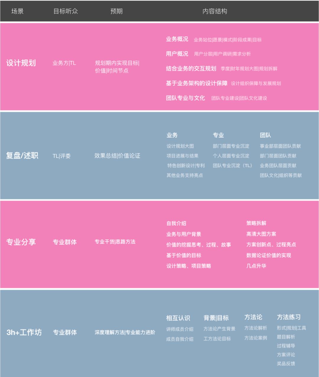 针对上述问题,本文将会从用户体验的角度以汇报总结的内容核心、面向对象、场景分类、内容标准等方面和大家探讨交流。