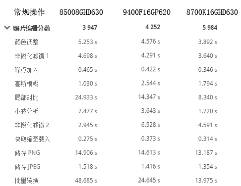 对于批量转换、局部对比操作6核12线程的3.7主频的8700K优势明显,存储、噪点加入、颜色调整等略高,而载入、锐化、截取、高斯模糊等操作用集成HD630显卡的8500处理器表现不凡,在英特尔为设计师推荐的处理器中,四或六核的i5、i7系列处理器都是2D设计师值得购买的产品。除了其多核特性能提供更强的多任务运算能力外, 英特尔睿频加速技术可以在系统负载较大时将处理器频率进一步提升。由于很多2D设计软件对处理器频率更为敏感,所以主频高核心多的i7 8700K为首选。