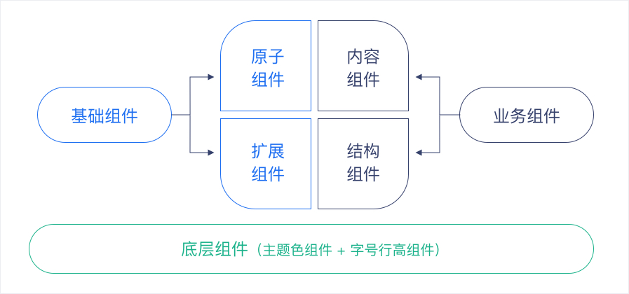 了解了组件化设计的概念之后,如何着手规划自己负责产品的组件化体系搭建呢?参照组件化的概念定义,我们需要先对当前的产品的视觉和功能元素进行拆解、归类与重构,筛选出来具有「相对稳定、可被复用、可形成标准」的组件内容,对其进行分类,依据不同属性与粒度,可分为三大类:基础组件、业务组件和底层组件: