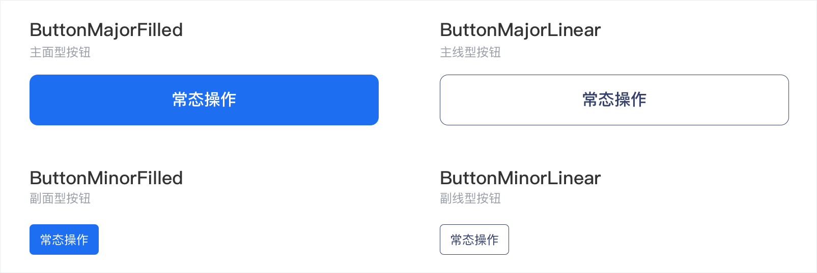 如上图所示,我们将按钮以“Major”、“Minor”和“Filled”、“Linear”这类描述功能特征的词来区分命名,而不是“Blue”、“White”这种视觉属性的名称。这种命名方式的好处在做组件视觉语言升级时将尤为显著,当按钮不再是蓝色,升级为橙色、绿色或者是黄色,便不会对最初的命名产生任何影响,同样的命名规则应当应用于全部的组件命名过程中。