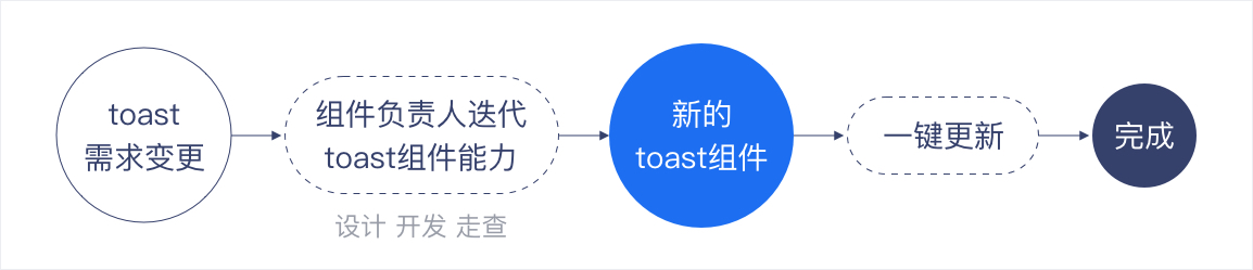 而在应用了组件化的情况下,事情就变得简单的多了,负责组件的设计师给到负责组件的研发人员最新的toast样式规则,新toast开发完成后做组件的走查与测试,确定样式正确、功能全面后,组件的研发负责人做端内的toast组件一键更新,全部的toast样式即可更新完成。