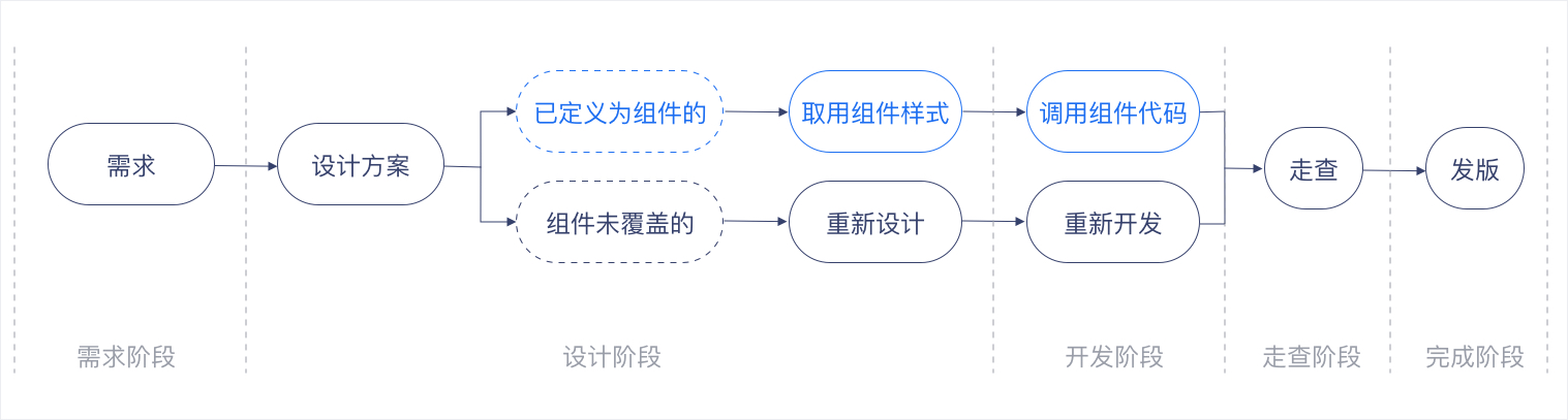 上图清晰的展示了组件应用流程,其实是与我们正常的需求流程是一致的,不同的是在设计阶段,在遇到组件时,设计师可以直接取用定义好的规范样式,进入开发阶段,研发同学也可直接调用已经开发好的组件代码,这一过程极大的节省了设计与研发时间,提高了工作效率。