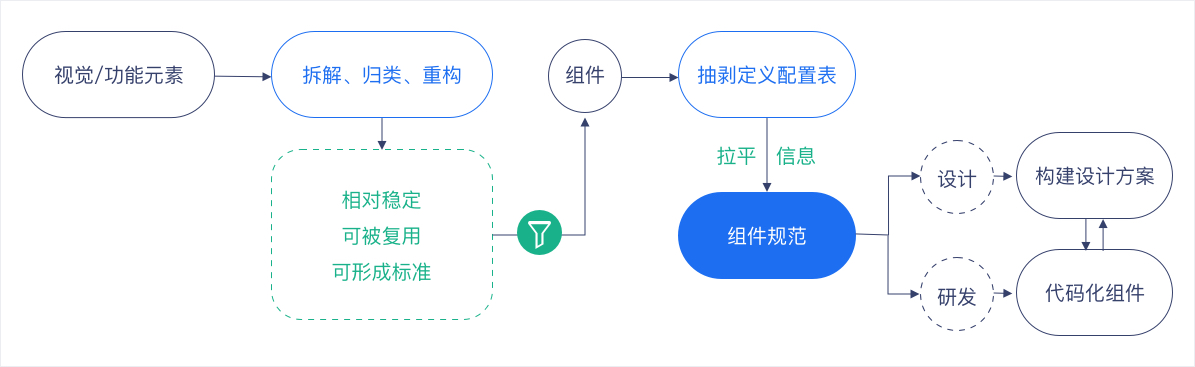它是通过对页面视觉元素和功能元素的拆解、归类、重构,基于相对稳定的特性、力求可被复用的目的,最后形成的可被清晰定义属性的规范化组件,通过对组件的多维复合应用来构建设计方案,并输出与研发既成共识的标准对接规范,代码化组件样式,从而降低信息差、提高设计到研发的工作效率。