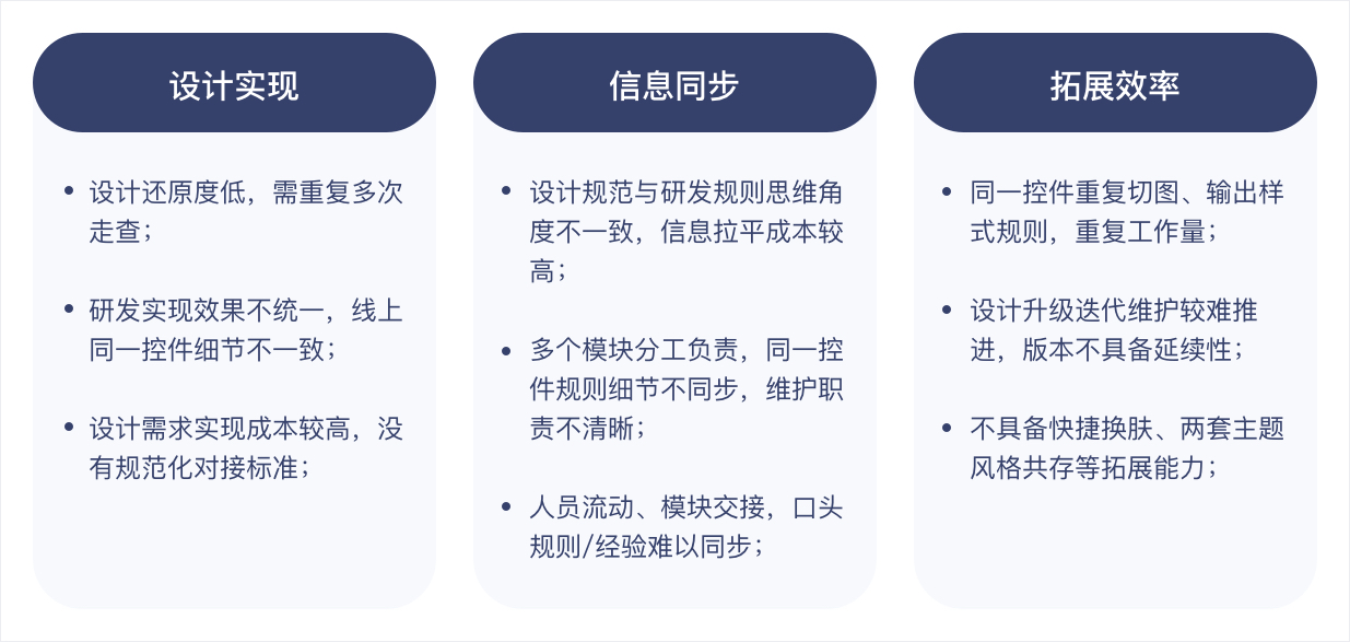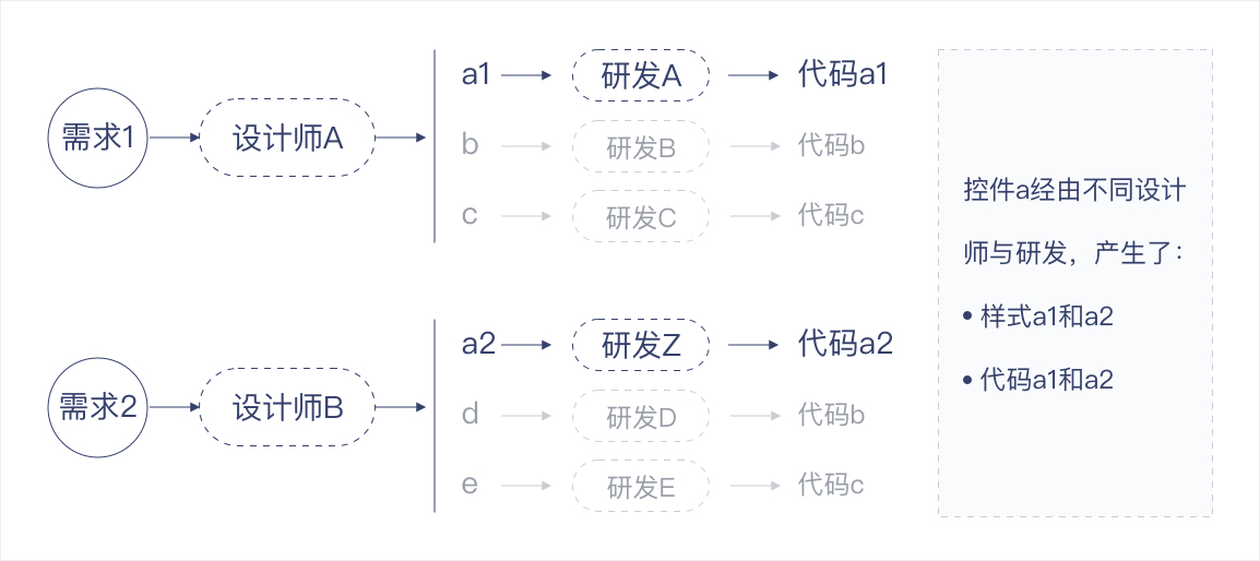 在工作中,大多的需求流程是各个设计师独立并行的,同样的功能样式常常有着不一样的设计细节。当进入开发阶段,可能会存在不同研发人员并行开发同一功能需求的情况,同一种视觉样式会因不同人员的开发习惯差异,出现多个代码内容,增加了管理难度。