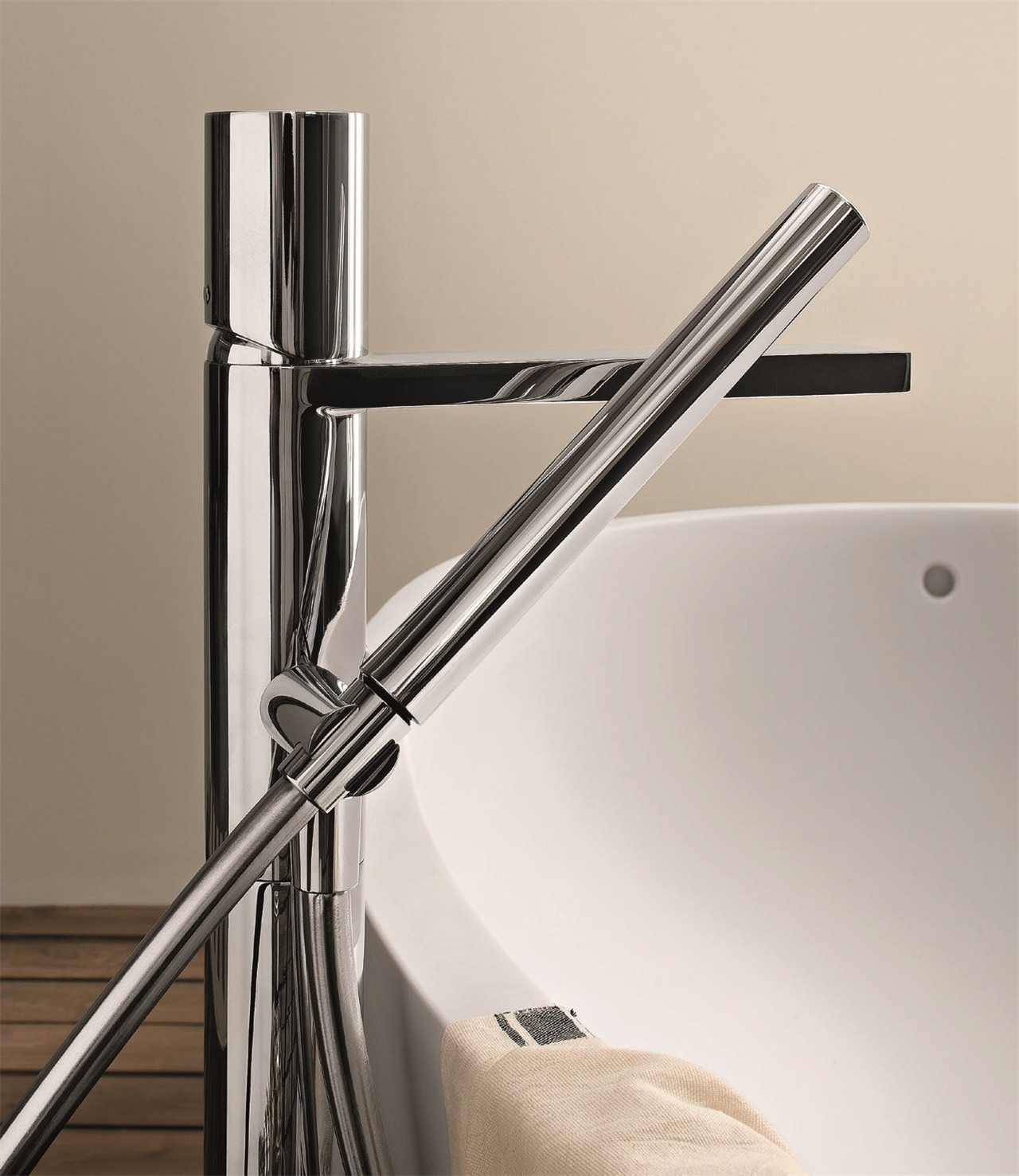 设计者为Franco Sargiani的MILANO - 3380A/3080B浴缸龙头适合与独立式浴缸配套使用,需要安装在浴缸与地面的连接处,配有合适支架和PVC柔性把手的淋浴柱。