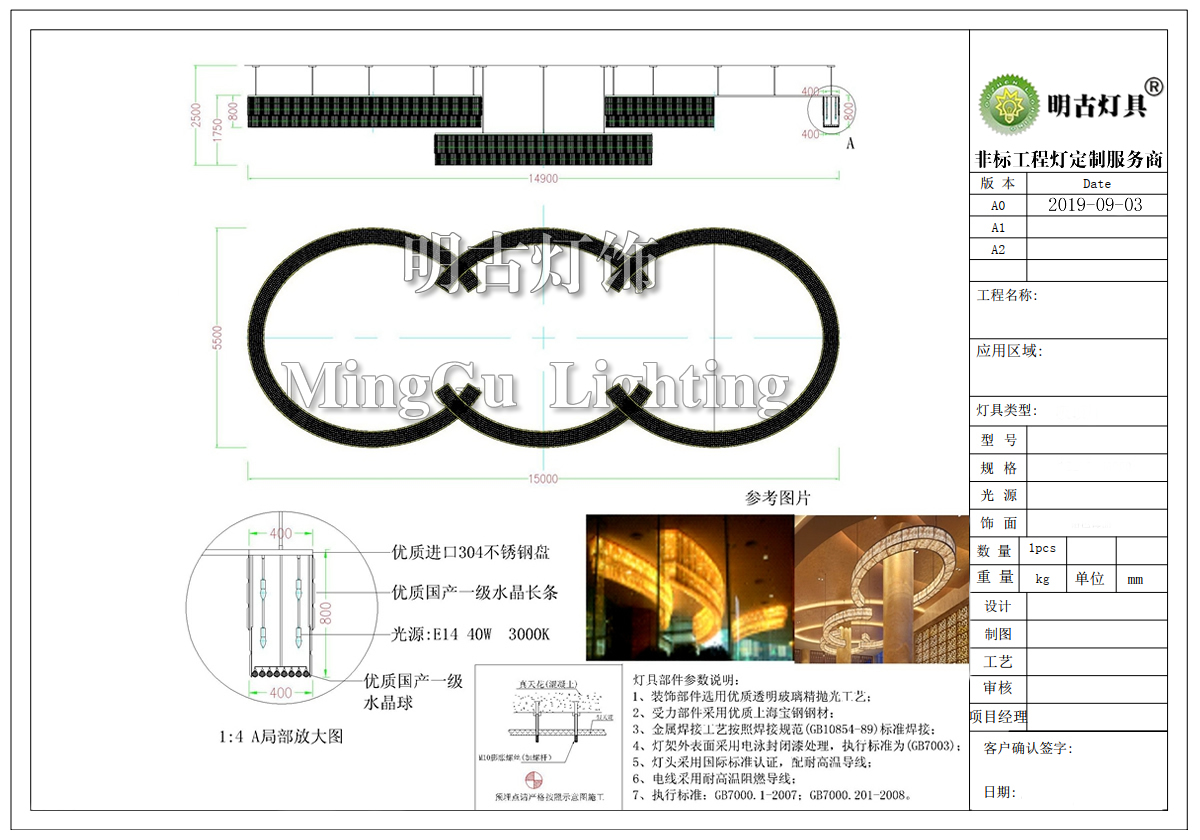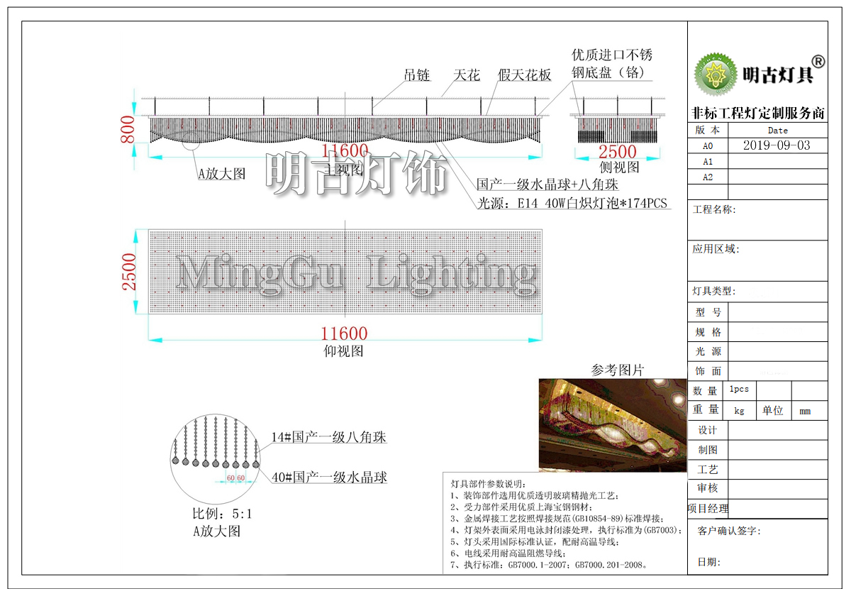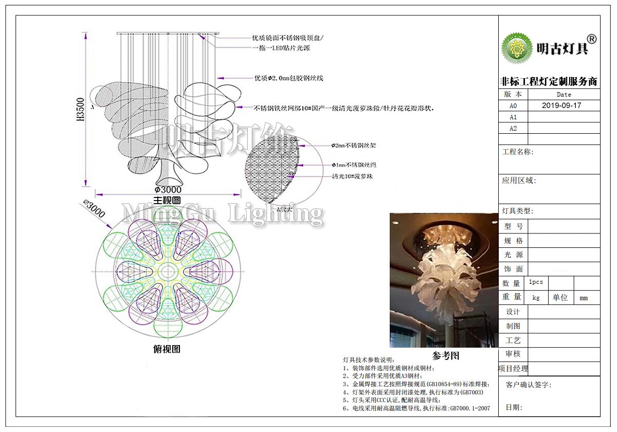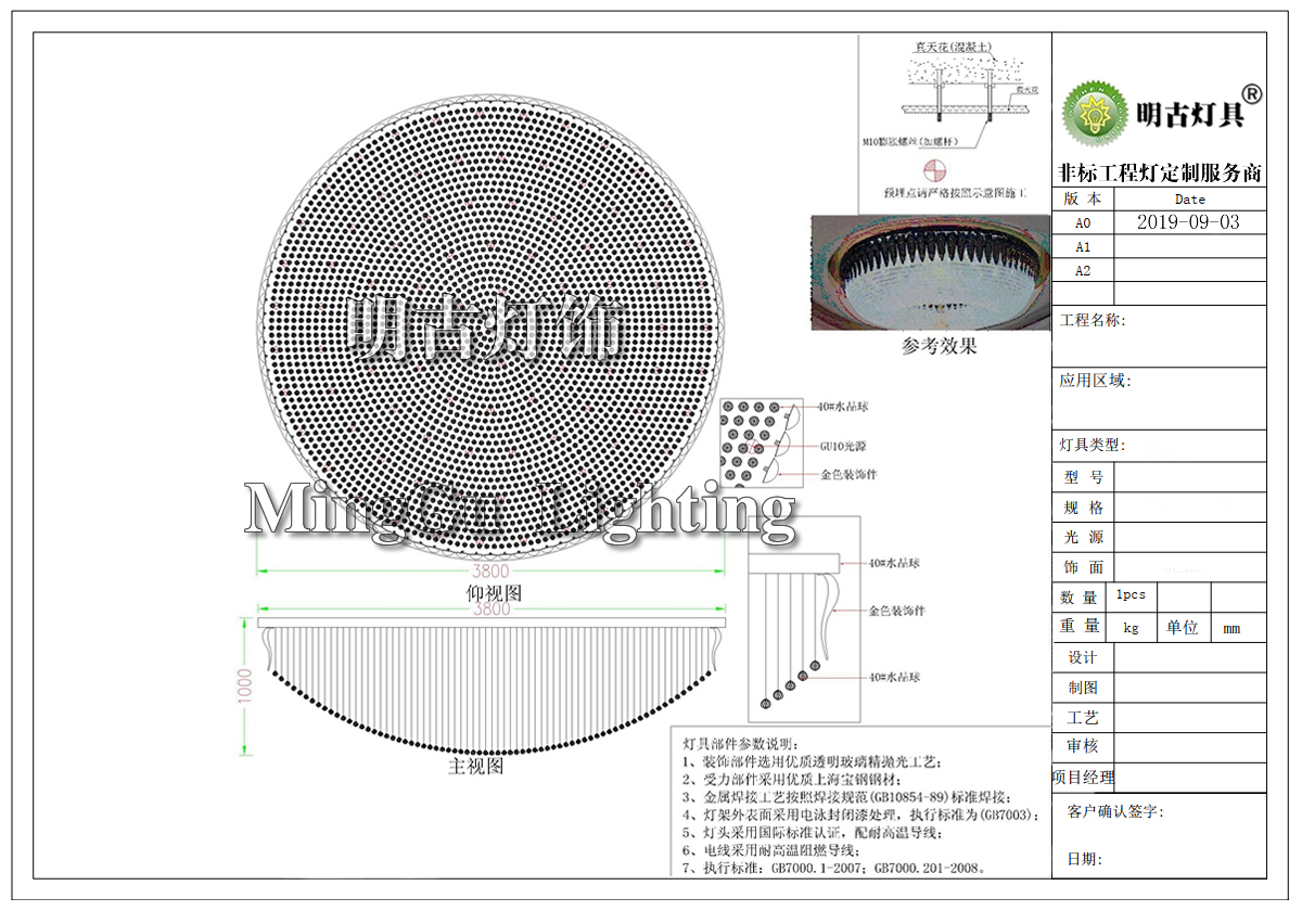 中山市横栏镇明古灯饰厂设计部2019年09月份共完成灯具设计结构图方案15张,按灯具类型分:非标工程灯、艺术工程灯、水晶灯等;按工程项目分类:售楼部、酒店、餐厅、会所等项目;按客户地域分类:辽宁、贵州、安徽、四川等地。