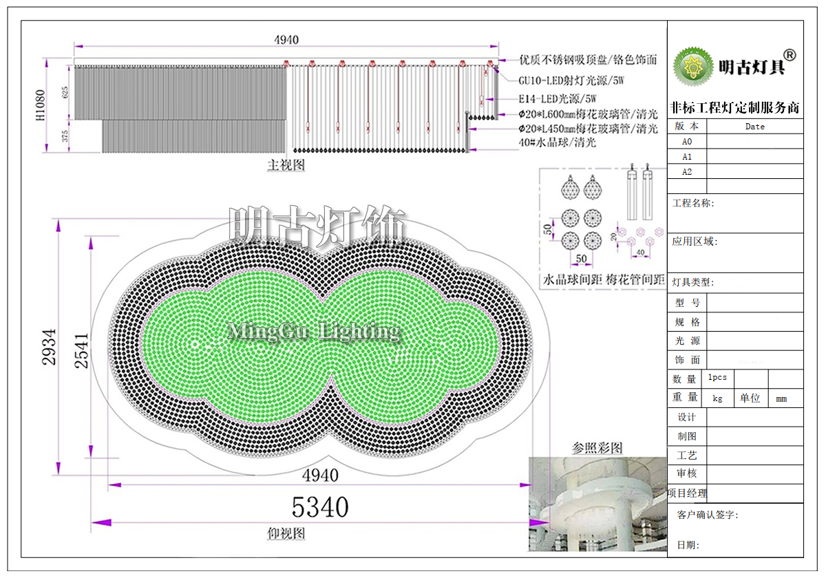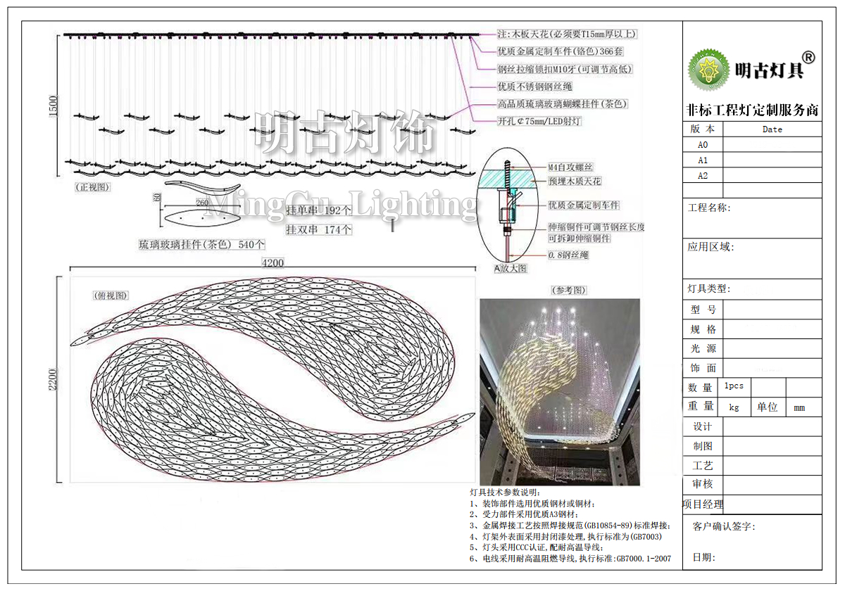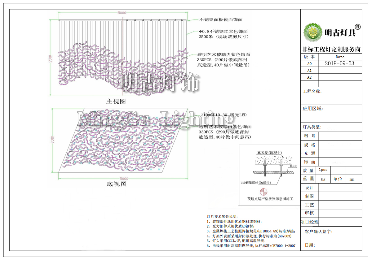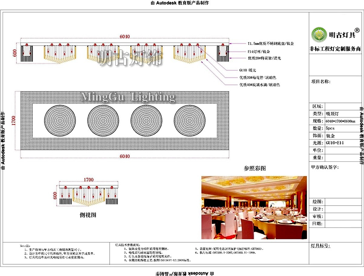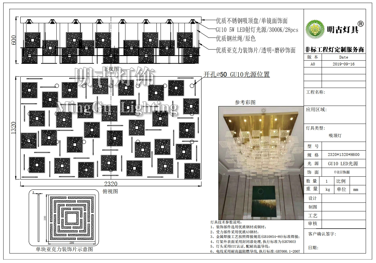 中山市横栏镇明古灯饰厂设计部2019年09月份共完成灯具设计结构图方案15张,按灯具类型分:非标工程灯、艺术工程灯、水晶灯等;按工程项目分类:售楼部、酒店、餐厅、会所等项目;按客户地域分类:辽宁、贵州、安徽、四川等地。