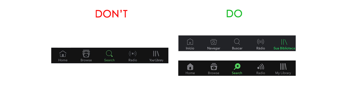 细节上审美统一让你的设计看起来是一个整体。一套小图标不仅相互之间要保持统一,还应该和应用保持一致的风格。作为专业视觉设计师的你,在时间充足的情况下,千万不要去网上随便下载几个图标直接用,不管是面、线、抑或线面结合,都要确保风格一致。如下图,左图是 Spotify 早先的版本的 icon,线、面混杂,粗细不一。右图分别是后续版本修改后的图标(上),以及设计师 iconwerk 给出的优化方案(下)。