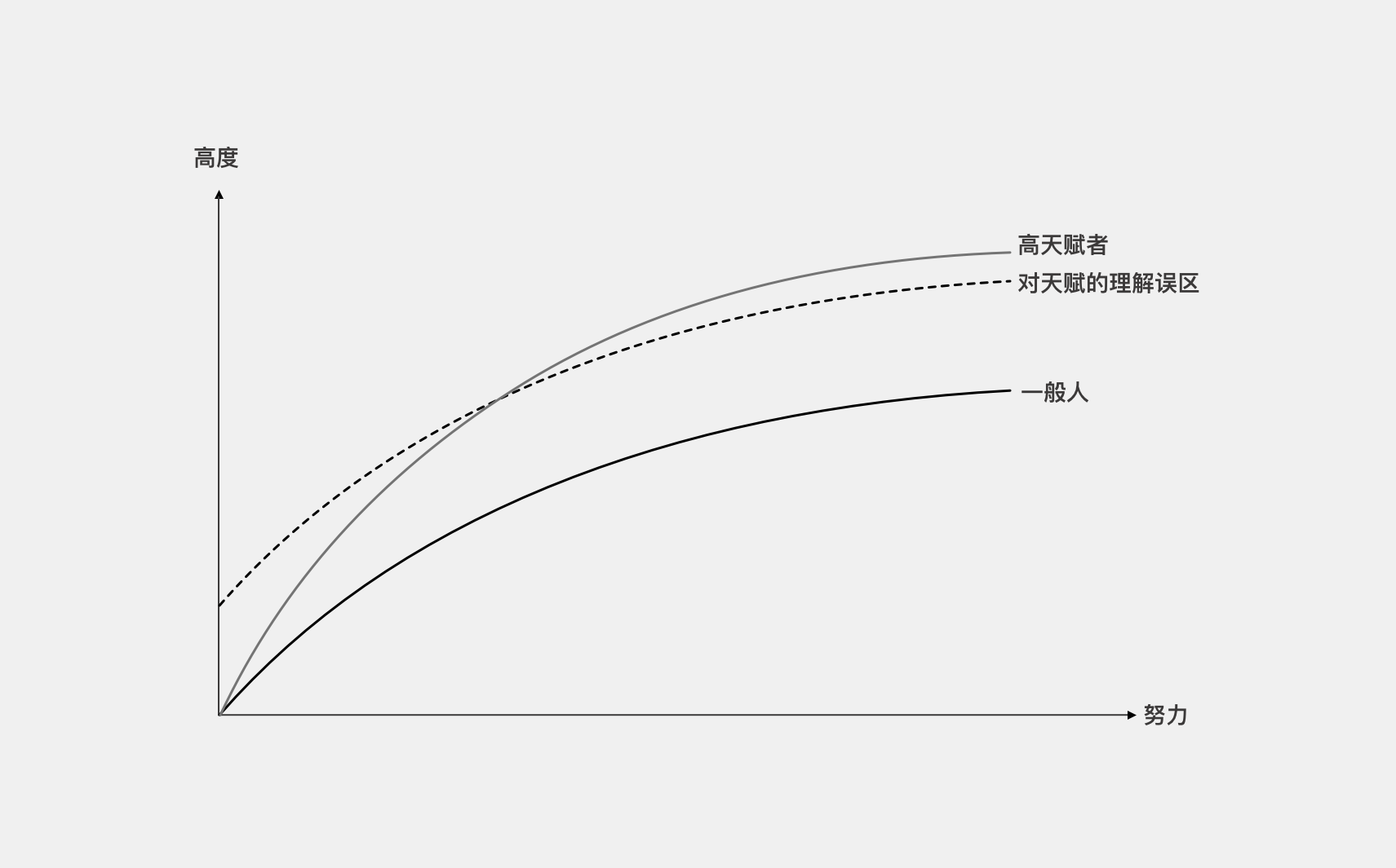 也就是说,在某个领域内天赋高的人和这个领域里的一般人,他们的努力与水平之间的关系,类似于图片里的两条实线。