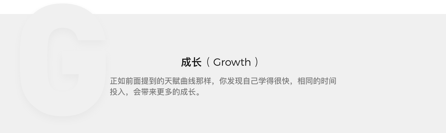 字母G对应的表现是 Growth,成长。正如前面提到的天赋曲线那样,你发现自己学得很快,相同的时间投入,会带来更多的成长。