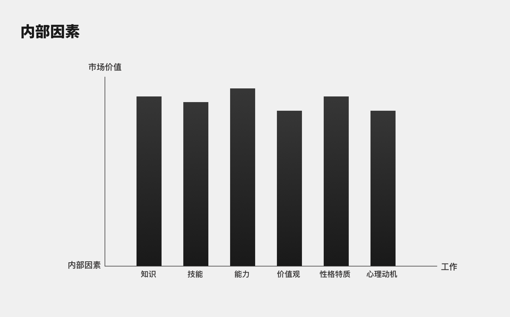 而内部,其实就是我们在冰山模型各个要素上的表现,我们的知识技能越多,能力越强;价值观、性格特质、动机跟所做的事情越匹配,那你的市场价值就越高。