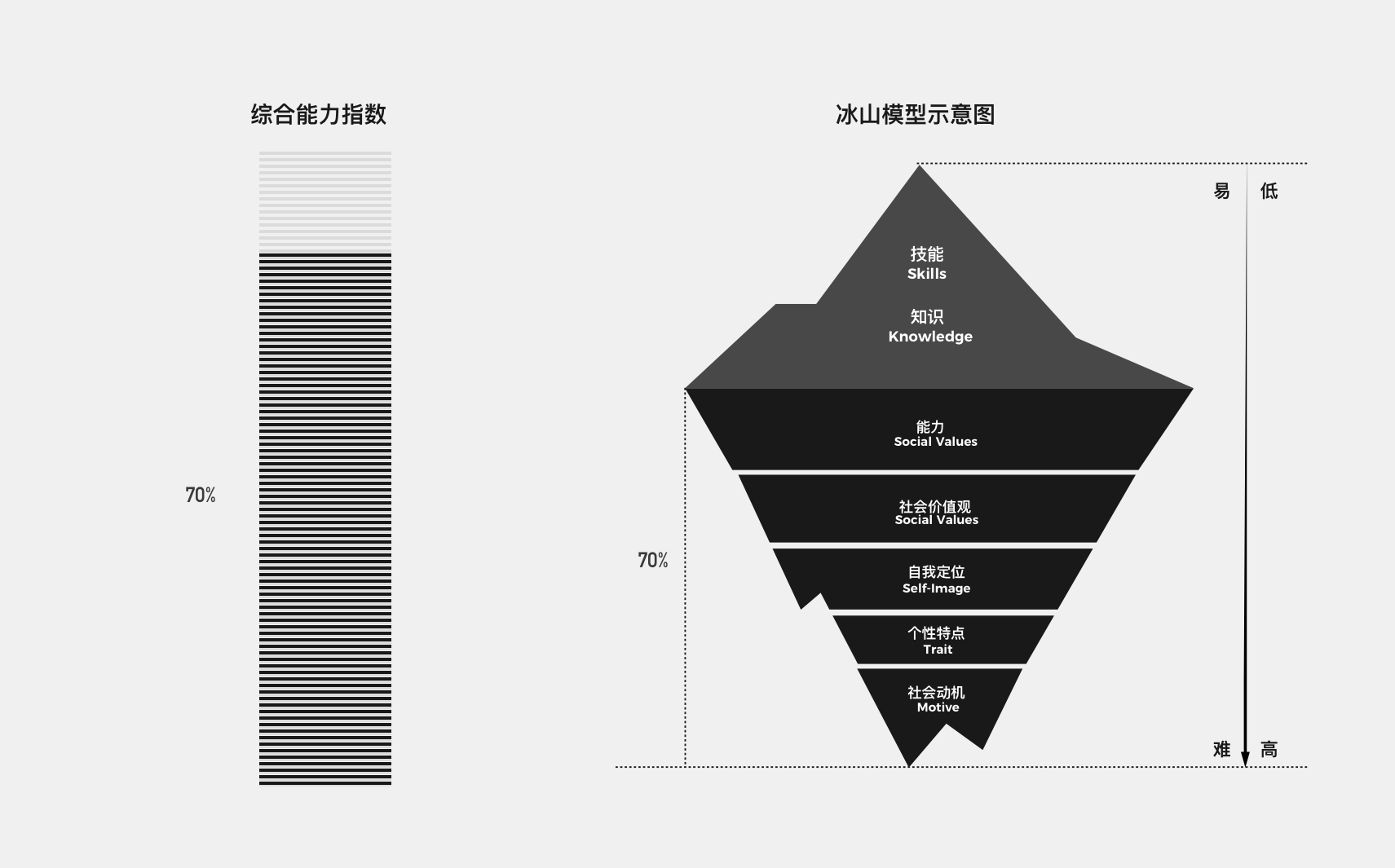 那就是整个冰山模型越往下的要素,越难培养、越难发现。