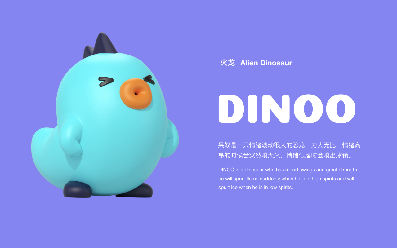 DINOO is a dinosaur who has mood swings and great strength, he will spurt flame suddenly when he is in high spirits and will spurt ice when he is in low spirits.