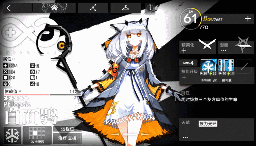 明日方舟的角色界面,当玩家从详情界面转入精英、潜能或者技能等次级界面的时候,界面的主体始终是角色。