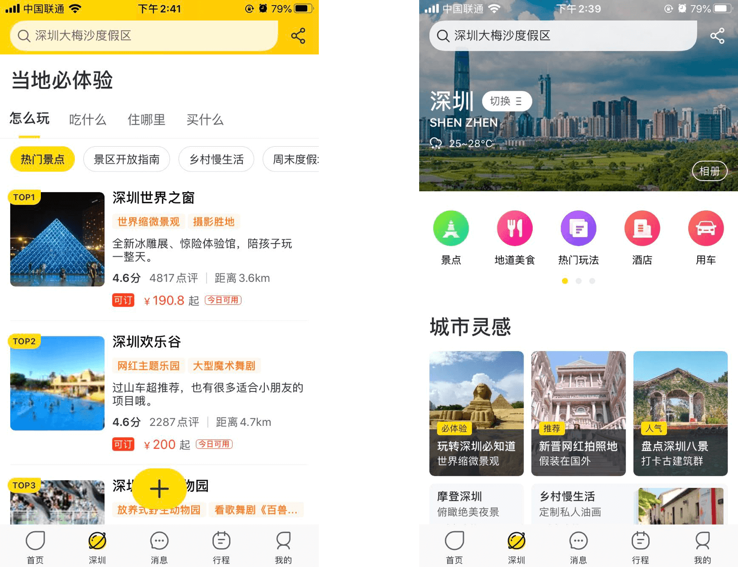 拿旅游类产品APP来说,旅行游玩型用户较为关心的问题——玩什么,怎么玩,行程预算是多少。以飞猪的攻略页面为例,当地必体验模块下的四个tab,从用户角度出发定义标题文案——怎么玩,吃什么,住哪里,买什么,基本上涵盖了游玩最关心的几个问题。列表内容根据人气指数排列,关键词标签,描述,评分,评论数,距离,价格等重要信息外显,基本上抓住了用户利益相关最重要的几个层面,使用户产生持续浏览的动机,从而向业务转化。另外,顶部的城市图片中增加当地天气温度信息也是一个可圈可点的细节。
