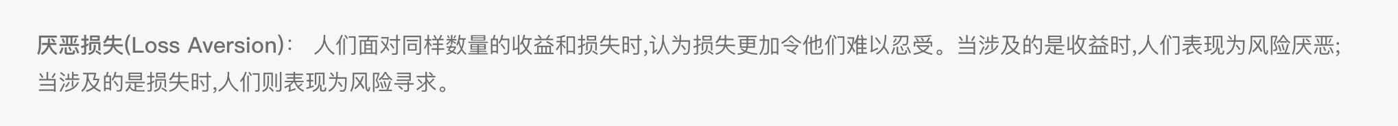 厌恶损失,有两个不同方向的表现:当面对确定的收益,人们表现为求稳妥,不愿失去;当面对的是损失时,人们表现为求取风险。举一个例子,如果面前有2000块和3000块,有两个选择:你直接得到2000块;或者,20%可能性拿到3000块,80%什么也得不到。这个时候大部分人会选择直接拿走2000块,这是因为面对收益状态时,人们往往小心翼翼,选择确定的好处。