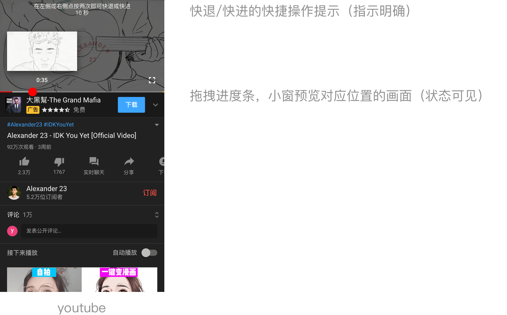 操作前可预知,即信息清晰,指示明确,状态可见。信息清晰较好理解,遵循用户的习惯,使用容易理解的表意方式,避免过度创新造成不必要的学习成本。指示明确,告诉用户这个功能可以做什么;状态可见,明确操作后会达到的状态,减少试错成本。以youtube播放页面为例: