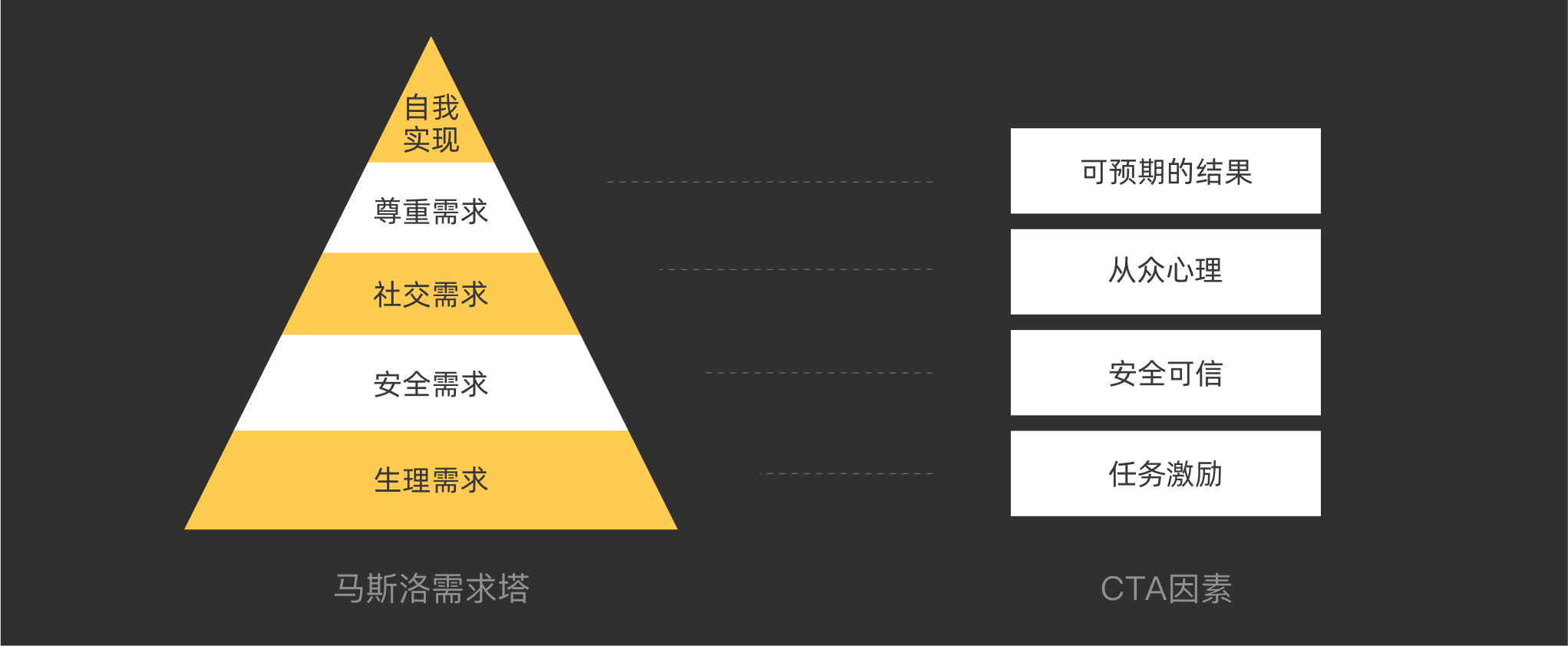 这里引入一个概念:CTA按钮,即(call to action)行动召唤按钮,源于营销术语,是指营销人员希望其受众或读者采取的下一行动。行动召唤可以直接将用户引导至购买。我将它引申为行动召唤因素,我将行动召唤因素定义为:任务激励,安全可信,从众心理,可预期的结果。