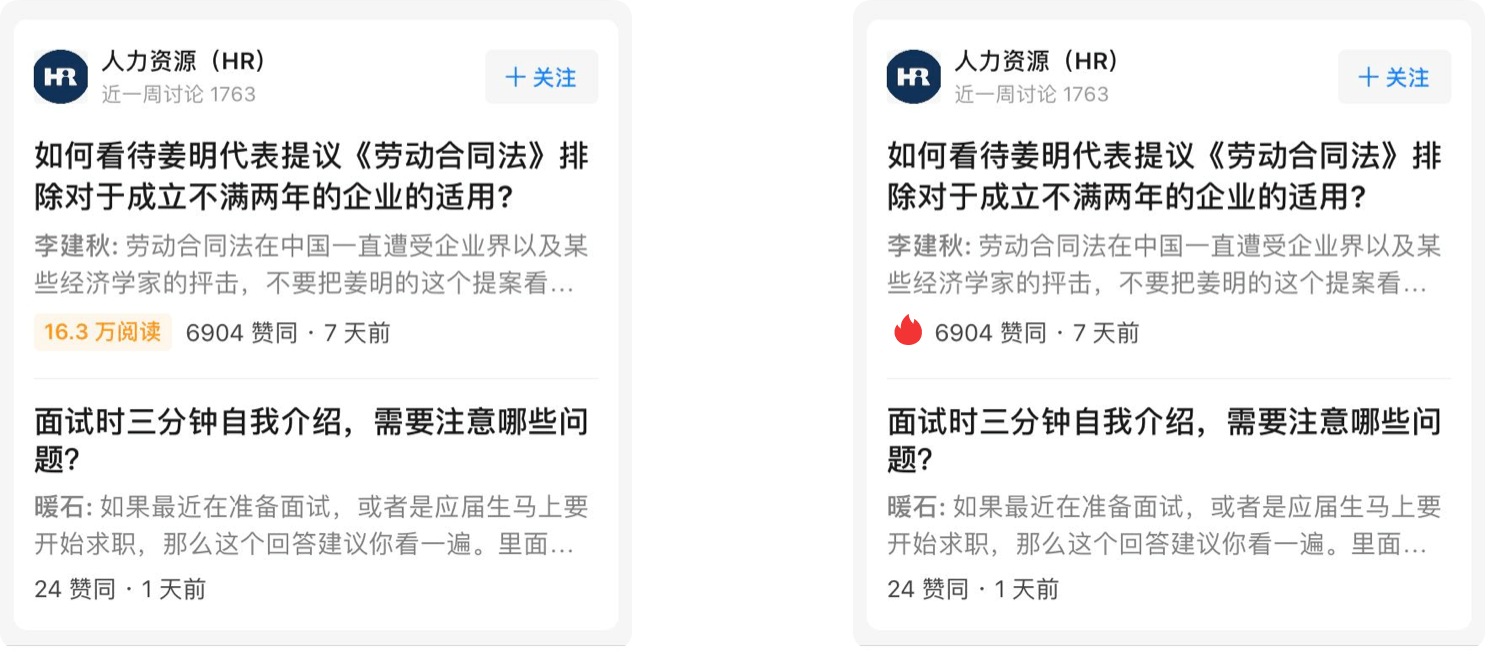 以从众心理为例,内容类、电商类产品常用增加xx人在阅读/收藏/点赞/购买等信息标签。这里我将16.3万阅读这个数字替换为表意热度的小火苗,对比来说流失了部分表意信息,没有文字表现力好,试想多个推荐文章出现在列表中,小火苗频繁出现,很快产生视觉疲劳。