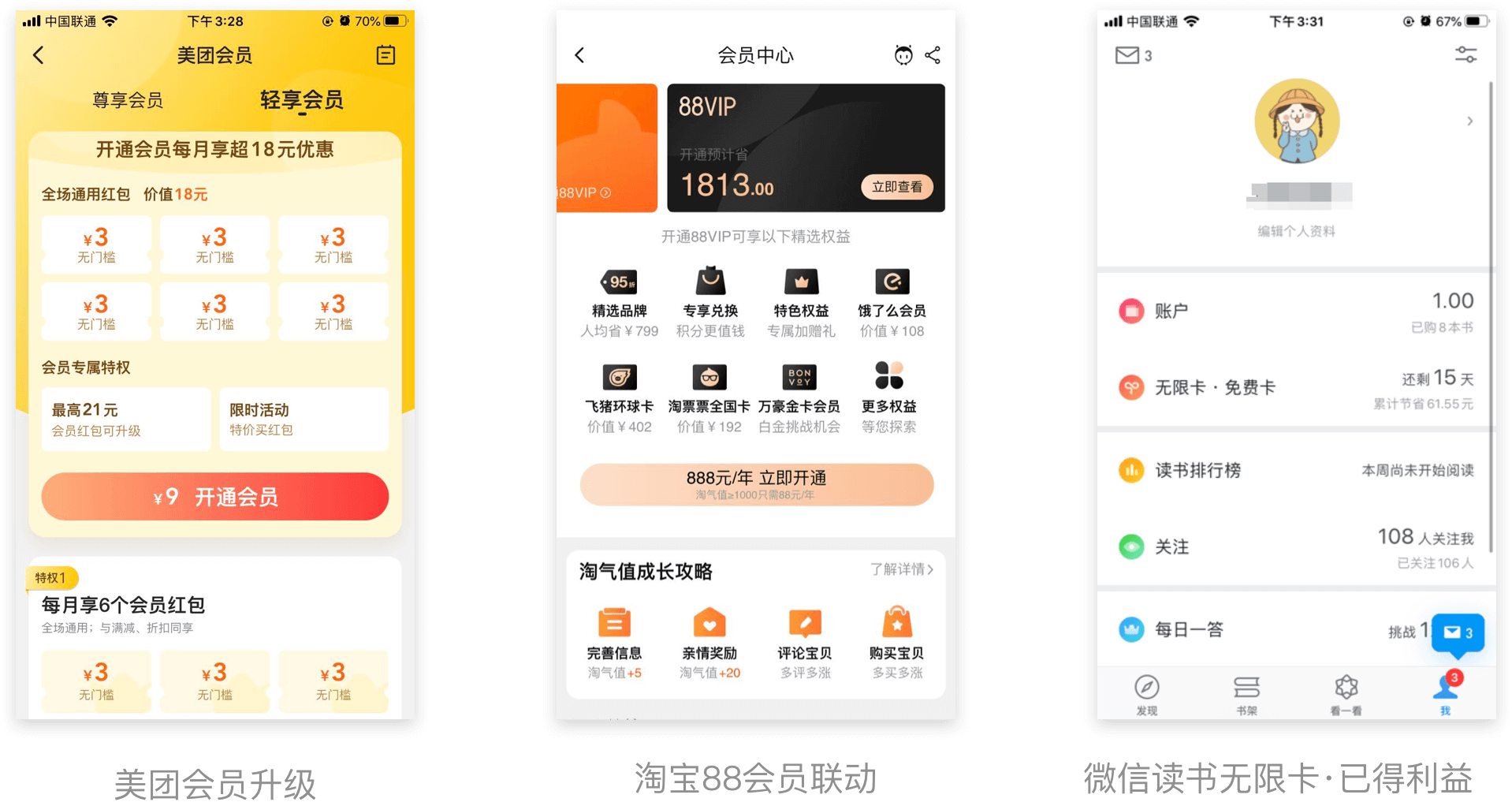 厌恶损失的应用在会员体系中最为常见,例如我们购买会员后,产品推出的会员升级,会员联动打包购买等策略,通常还会加上限时/倒计时这一技巧。设计层面则需要向用户直观的传达这些能够推动用户持续购买的信息,依据产品特性寻找出最打动人心的那一点。例如美团会员升级中,优惠券的拆分,感官上数量具有优势;淘宝88会员联动,888/年也不算是小数目,但进行了金额拆分,帮用户算了这笔“账”,物超所值;微信读书的无限卡已经帮助用户省去的金额,让用户一眼能了解自己已经享受到的优惠。毕竟用户是在浏览产品而不是研究产品。
