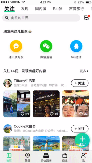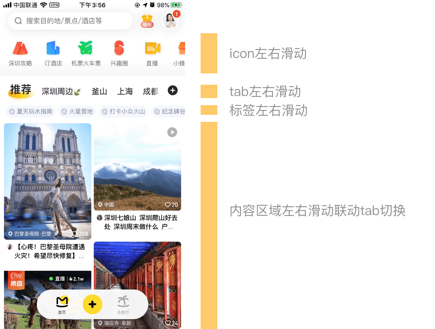 纵向的方式则需要注意滑动控制区域需要符合逻辑,例如马蜂窝页面间的十字交互的区域划分,层次就很清晰。