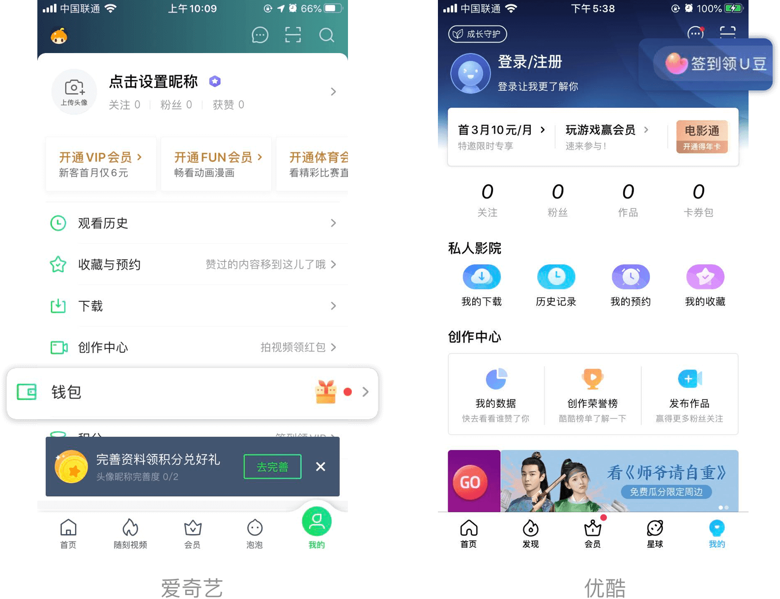 例如爱奇艺我的列表中,钱包选项后的礼物盒小图标,相比于用文案更具有吸引力;优酷视频签到的小豆子图标,QQ弹弹,让人产生点击的欲望。