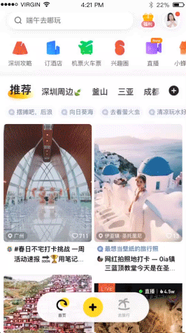 当物品元素过多时,我们常常会进行收纳与分类。在移动端产品中,可以大致分为横向与纵向两个角度:横向:不同类型内容页间的交互转换;纵向:同页面间不同元素的交互转换。横向的方式例如马蜂窝app,底部tab只有三个,没有采用常规的固定底部导航栏的设计模式,而是以悬浮按钮的样式浮在整个页面上。当用户下拉时,认为用户对当前页面的内容产生兴趣,则收起首页和去旅行两个tab,仅留发布动态按钮。再如穷游app中搜索栏的引导内容,当内容较多时,加入上下轮播效果展示。