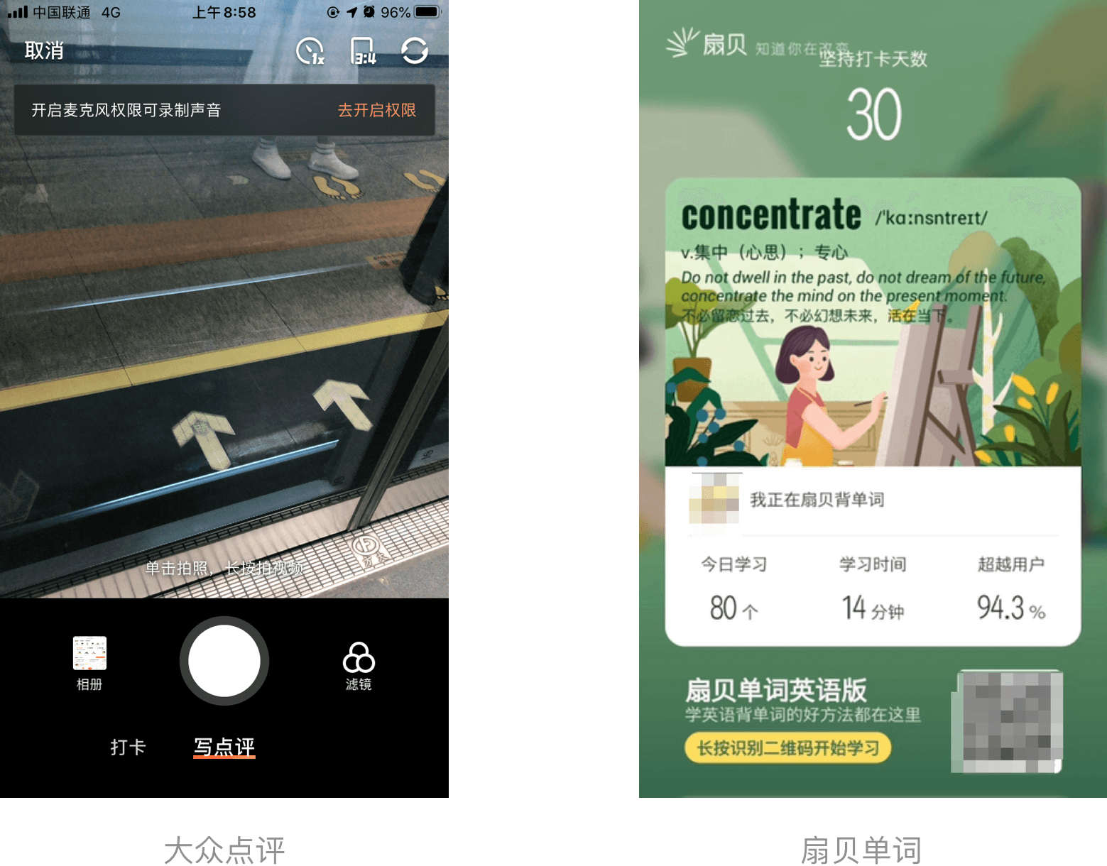 用户完成了产品任务的操作,我们还希望用户能够帮我们分享一下,利用个人私域流量,为产品带来持续增长。激发用户的分享意愿,即在用户情绪最高点提供持续愉悦体验。常见的比如生成分享海报,评论打分。尽可能的缩短分享路径,提供最具价值的工具,会带来更好的用户体验,从而带动分享增长。例如大众点评添加内容,提供滤镜,视频,选择画幅,视频速度等小工具,把编辑步骤浓缩前置,同时侧面帮助用户提升内容质量;扇贝单词的成果分享页,加入赏心悦目的插画,用户更有分享动力。