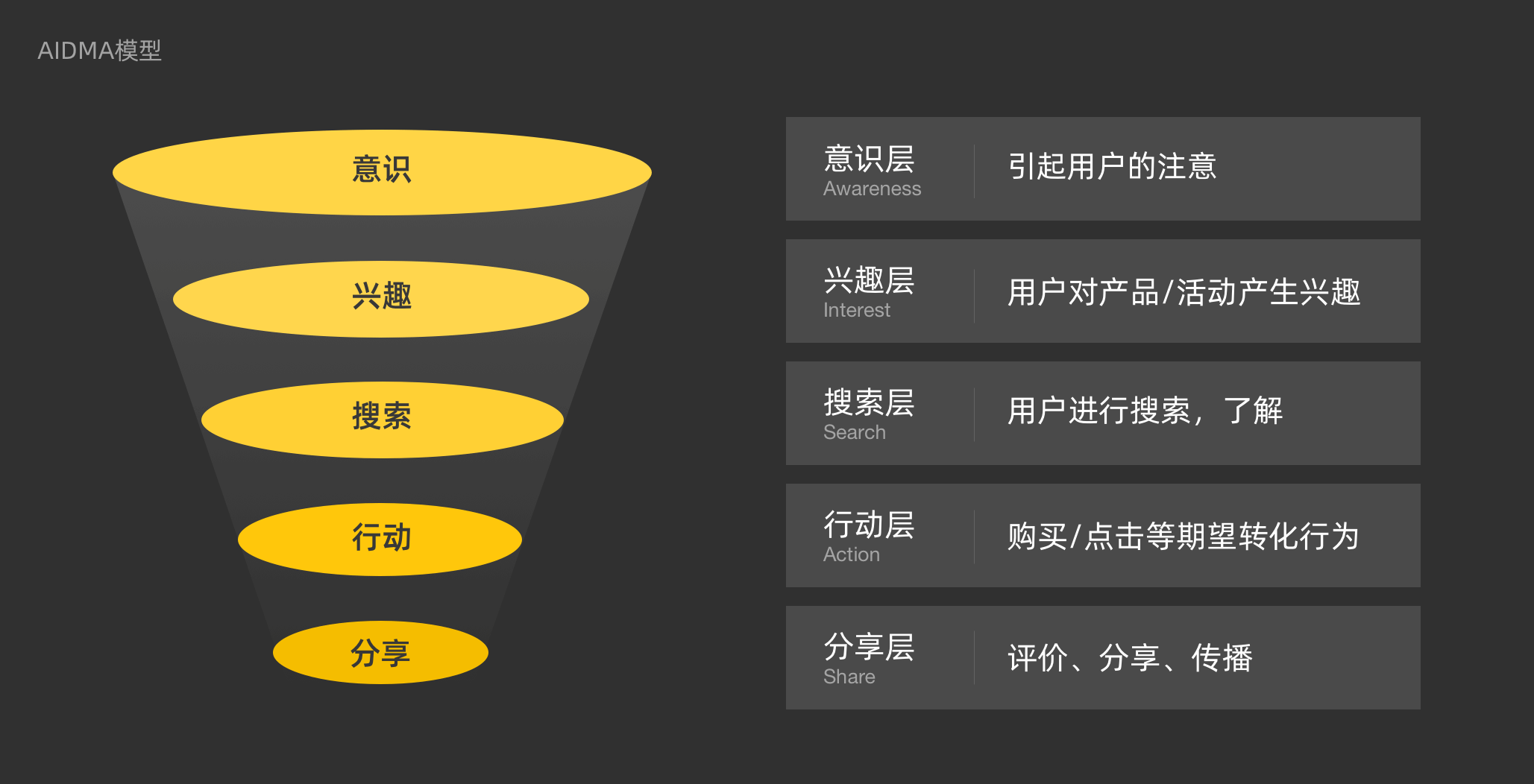 随着漏斗模型在互联网产品中的应用以及用户行为模式的改变,逐渐衍生出了更多的环节,这里以AISAS模型为例(意识-兴趣-搜索-行动-分享)。