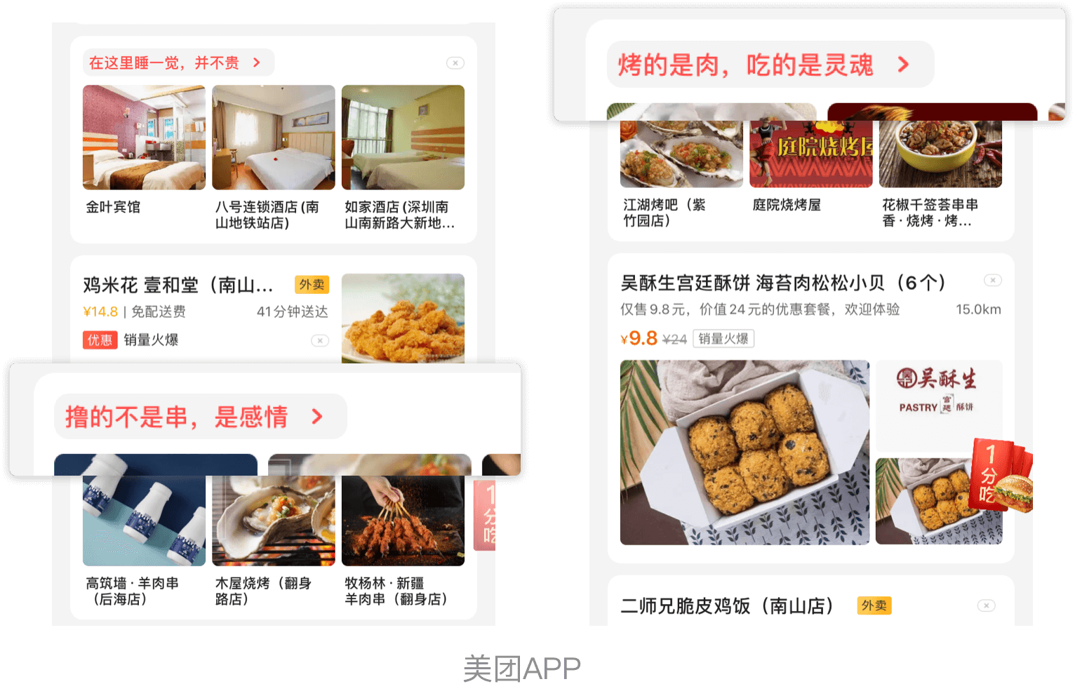 情感体验,或者可以说是亮点功能,是在用户期待值之外出现的惊喜。这一方面需要设计师把握出现时机,何时何地展现在用户面前,辛辛苦苦做了彩蛋却没多少用户知道,是非常可惜的。例如美团推荐信息流中的小标签文案,低成本的同时又引起用户情感共鸣,点击后进入相关内容聚合页,起到不错的导流效果。