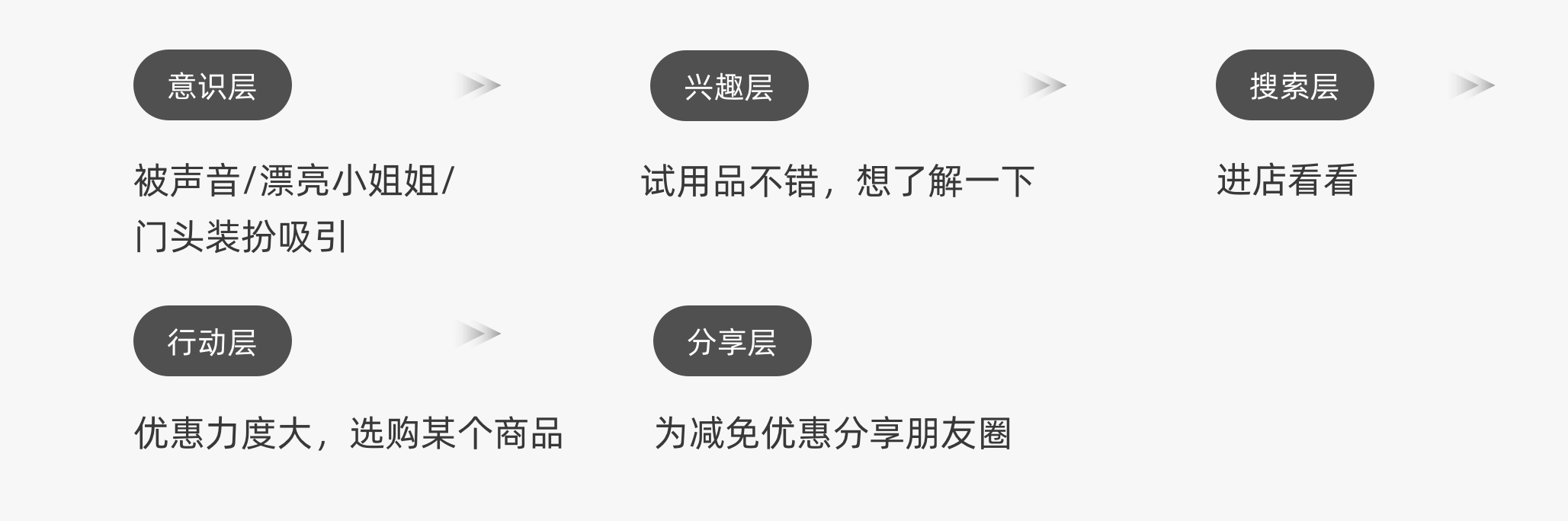当你在街上闲逛时,发现街边有家店在做活动:店面的门头有活动主题的装扮,服务员小姐姐穿着主题服饰在向路人分发试用品,店门口还有音箱在重复播放活动广告词。你觉得门头的装饰挺好看/挺有意思,小姐姐很漂亮。热情的小姐姐发现了你,马上塞给你一份试用品,你发现产品还不错,于是走进了这家店,又发现活动的优惠力度很大,于是买了一份你觉得你应该需要的东西。收银员告诉你,如果分享到朋友圈,可以再减xx元,于是你拍了照,发了一个朋友圈。