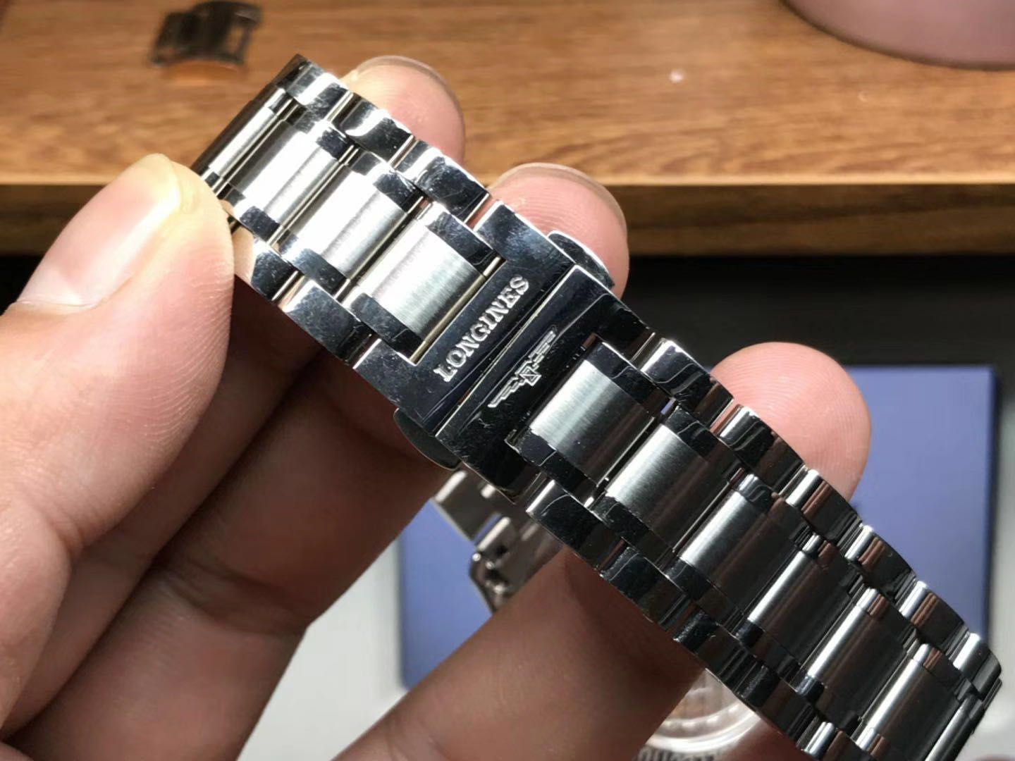 搭配的是一条316L精钢表链,整体打磨非常好,手感润滑不刮手,光泽明亮,工艺打磨还原度超高,整条钢带可同正品相互通用。搭载的是一个同样精钢打造的折叠扣,经过细致的工艺打磨,佩戴更加安全。KZ完美一比一还原了正品。表带上同样镌刻着浪琴经典的LOGO和英文字母,刻印的纹路也是极其细腻饱满。